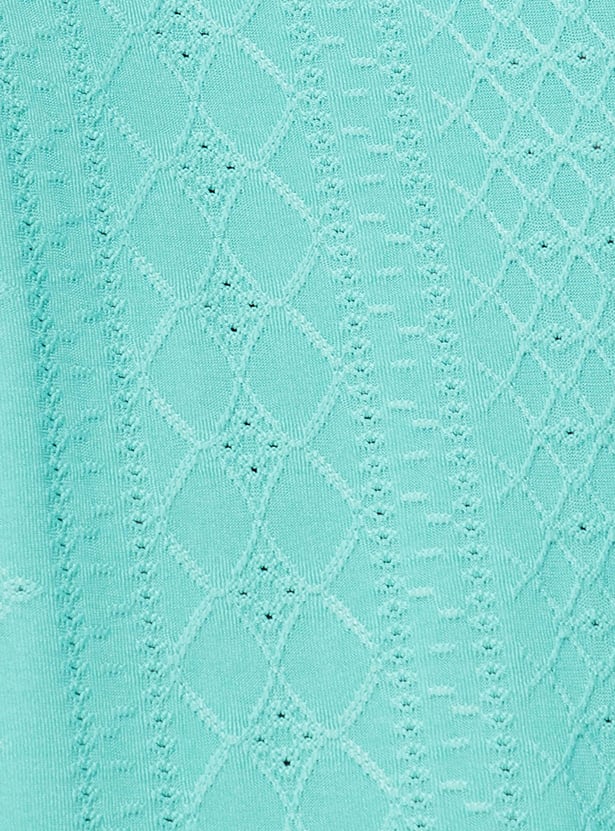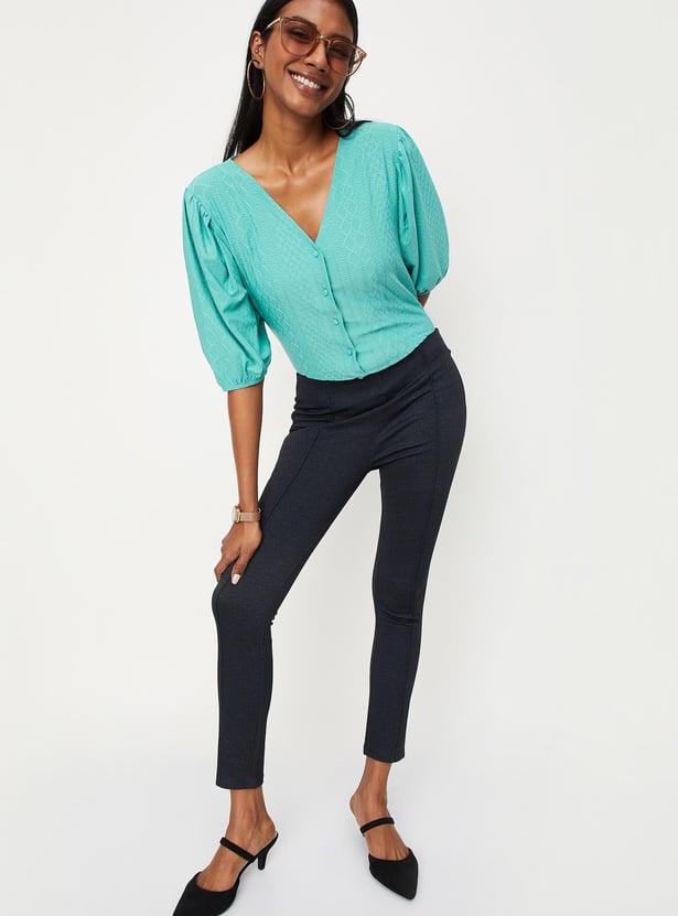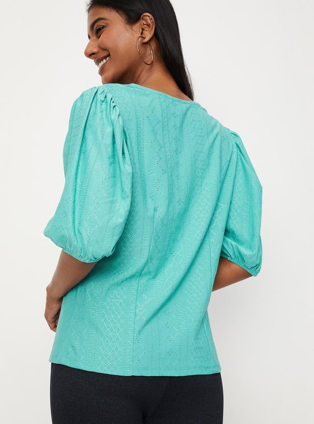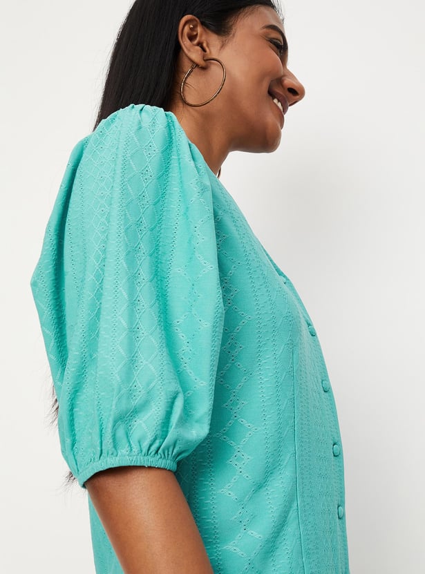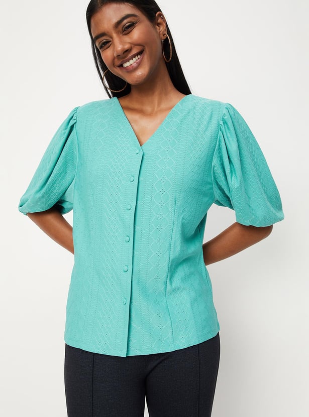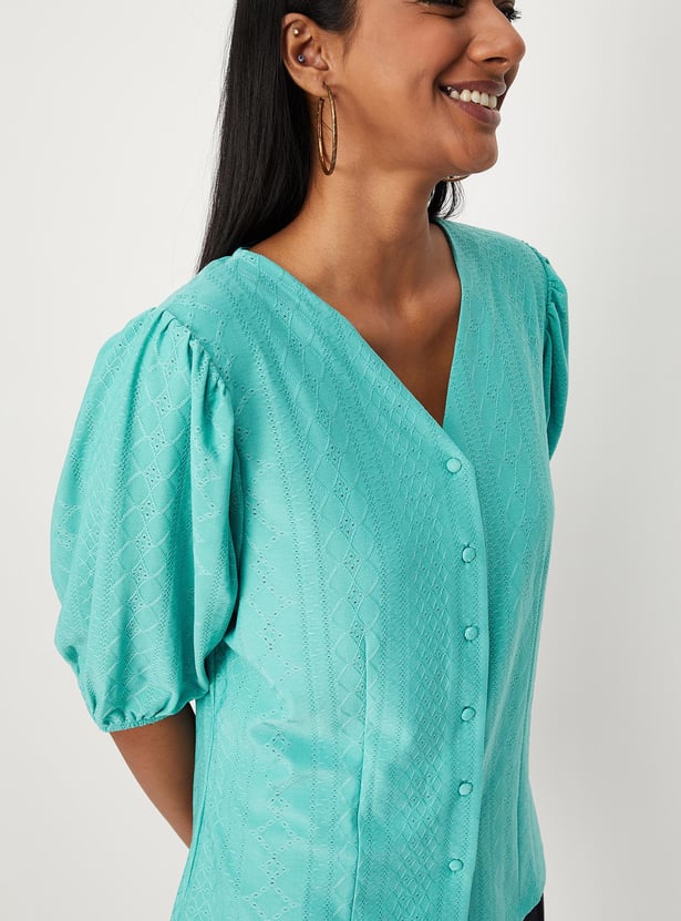 Flaunt a look of elegance in this top that is updated with schiffli embroidered details. It features a V-neckline, puffed sleeves, and a front button closure. Style this top with trousers and kitten heels for an elevated casual look.