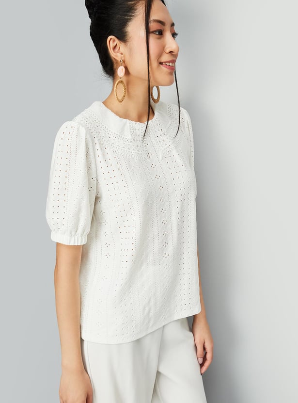 Revamp your casual summer wardrobe with this top. Boasting a peterpan collar and puff sleeves.