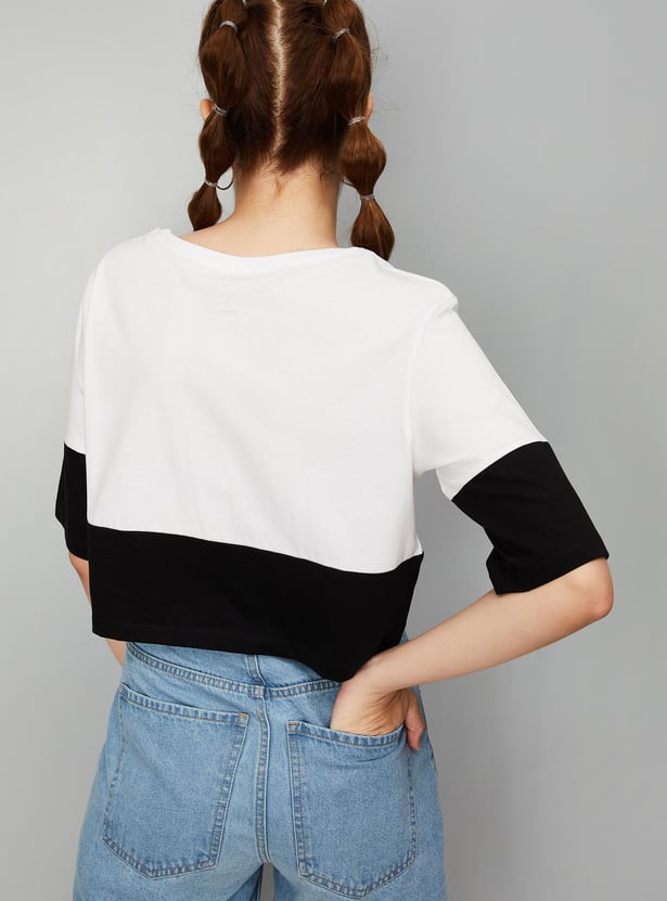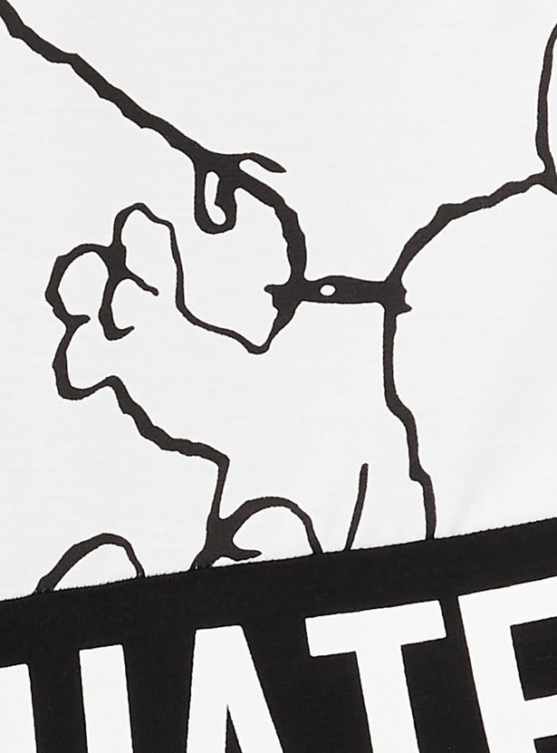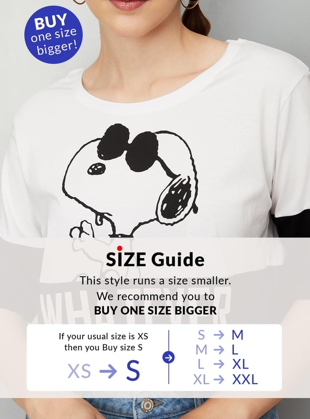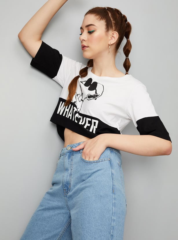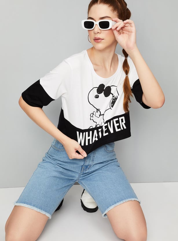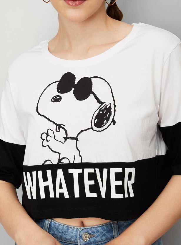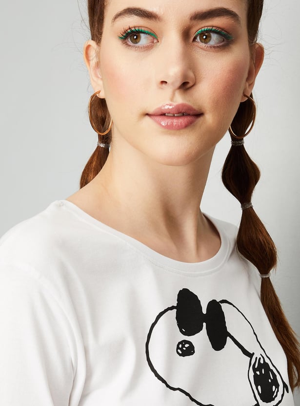 Bring a fashionable twist to your casual collection with this cropped T-shirt. It is designed with a Snoopy print on the surface, a round neck, and half sleeves.