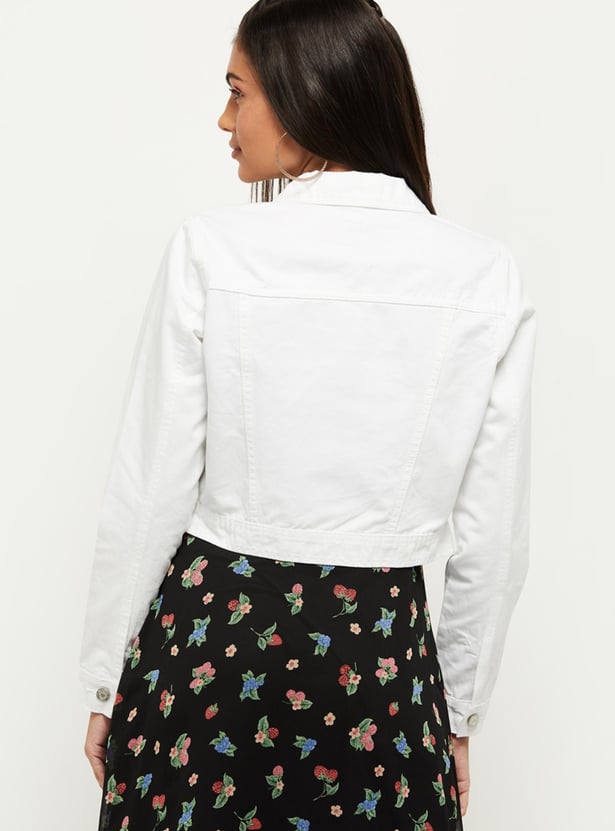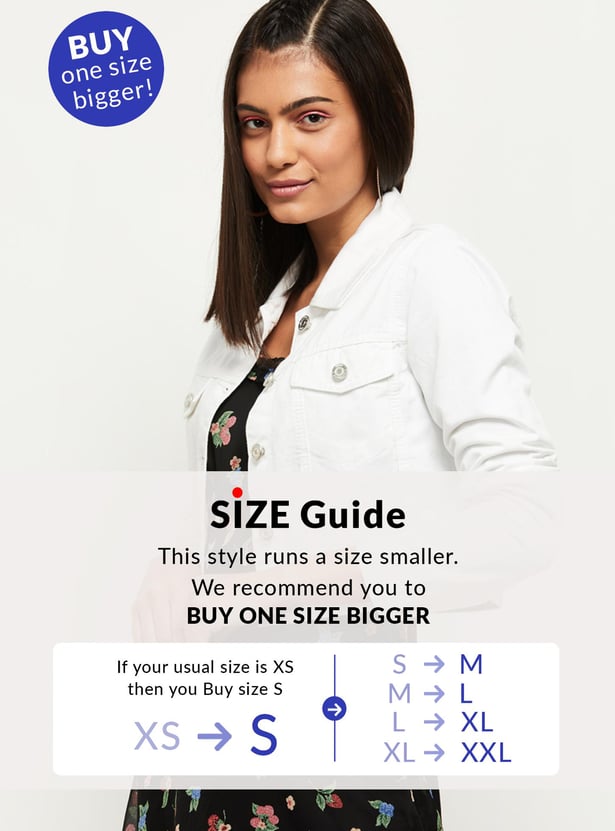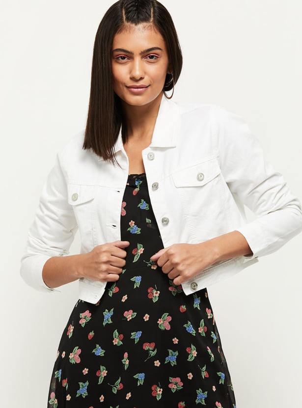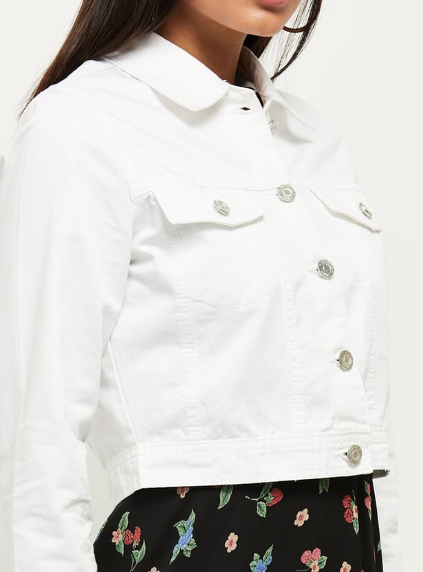 This denim jacket is designed with a solid surface, full sleeves, button closure, and flap pockets.