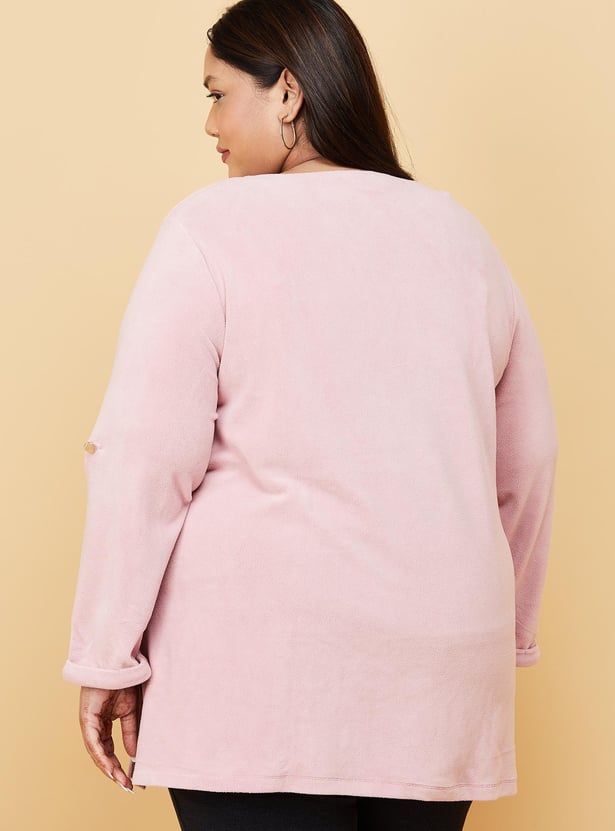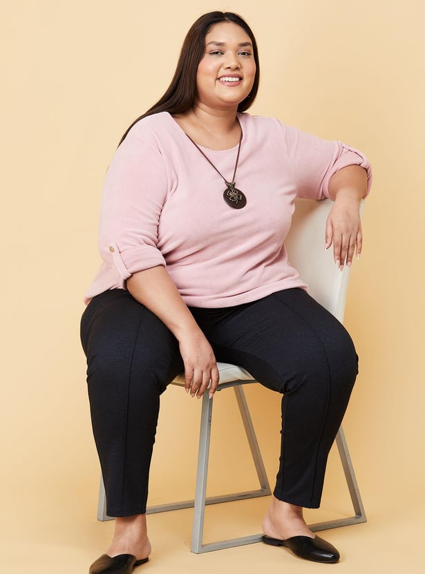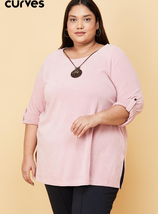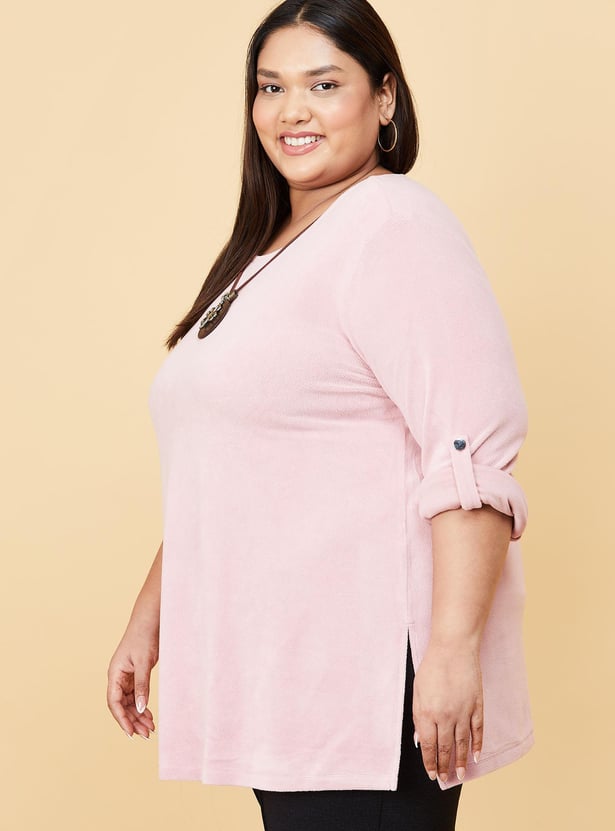 Update your wardrobe with this top fashioned in a solid tone with a round neckline, roll-up sleeves, and side slits.