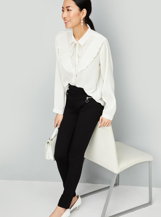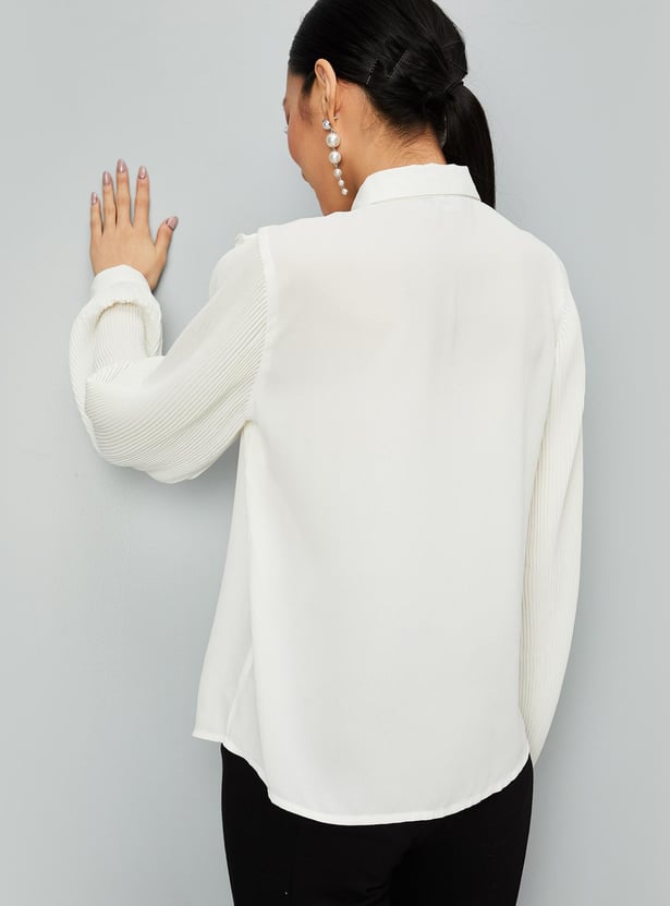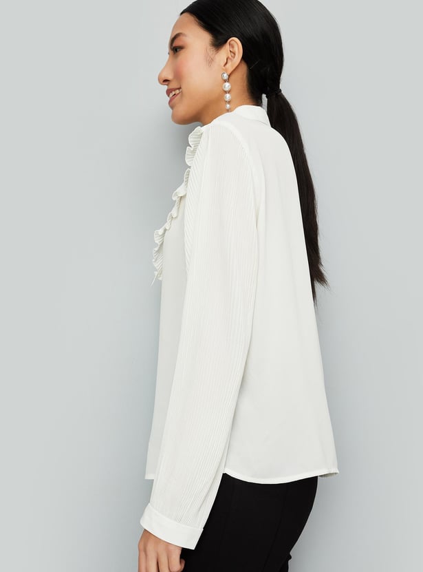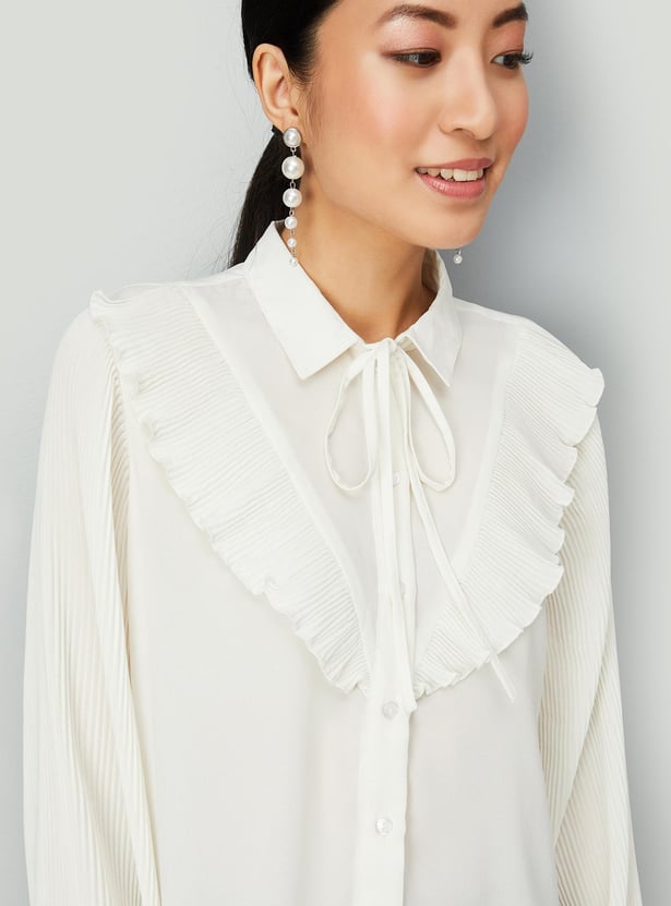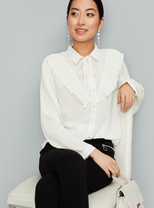Enhance your style by wearing this trendy top featuring full sleeves with cuffs, a front button placket and a collared neck with a tie-up. The pleated sleeves and ruffles enhance the style quotient. Model Size :