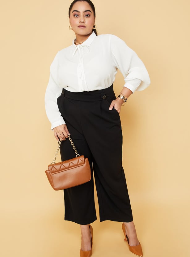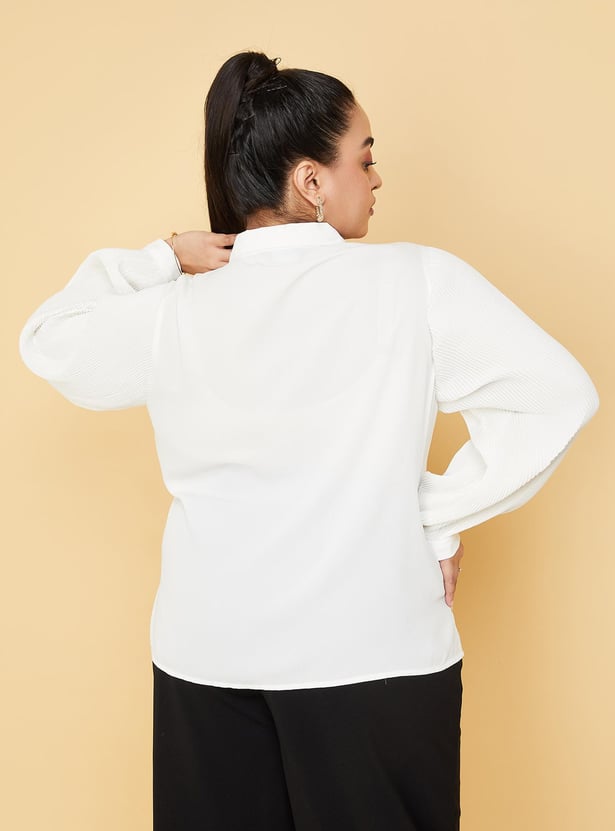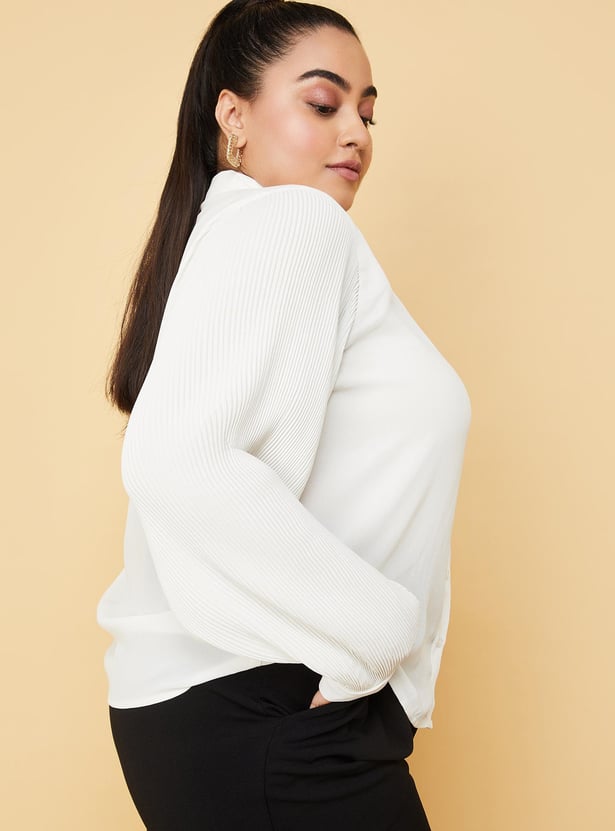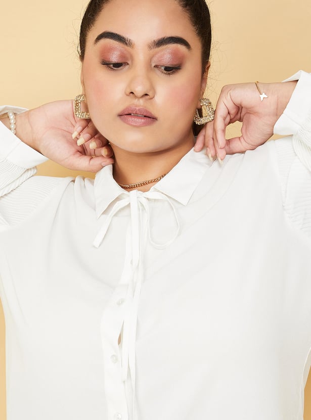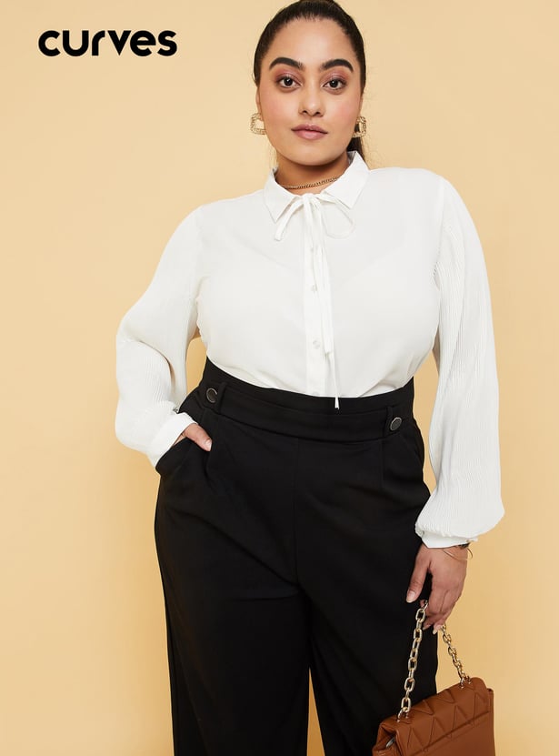 Enhance your style by wearing this trendy top featuring full sleeves with cuffs, a front button placket and a collared neck with a tie-up. The pleated sleeves and ruffles enhance the style quotient. Model Size :