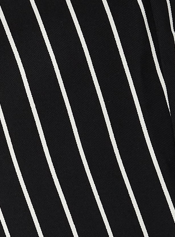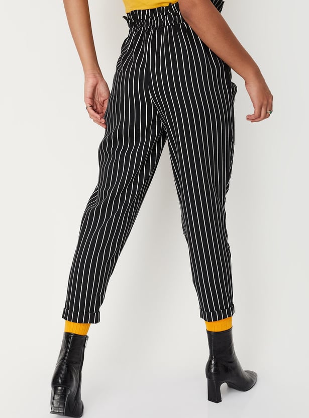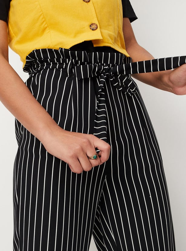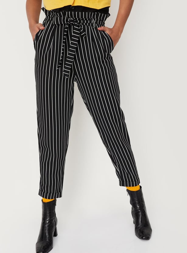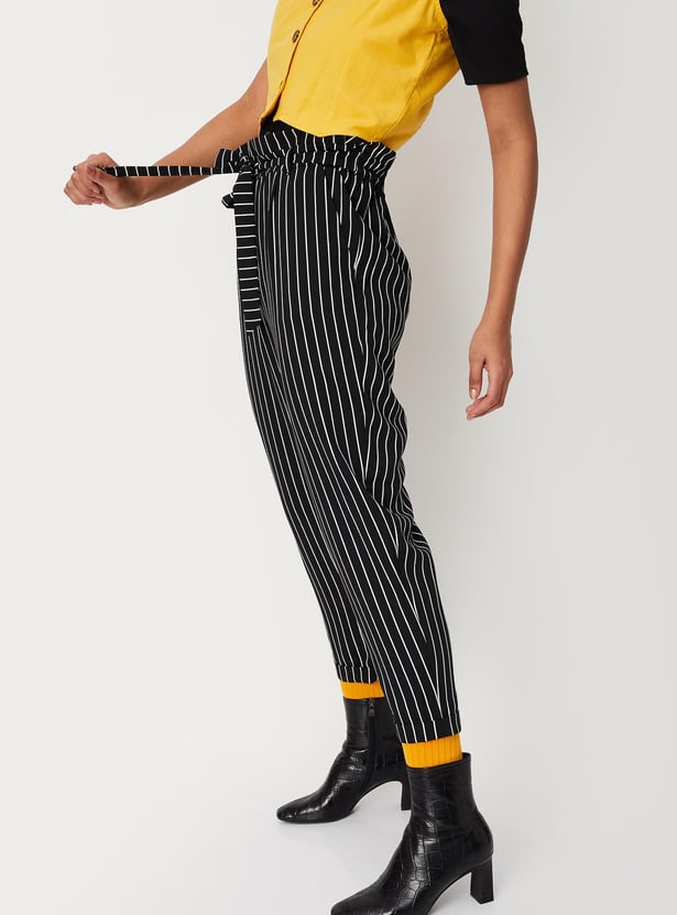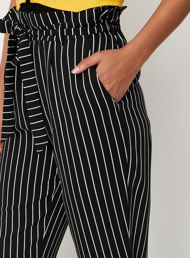 Own the room in these striped tapered-fit casual trousers that feature a waistbelt with insert pockets and a cropped length. Pair these trousers with a solid crop top and high-top sneakers for a chic appeal.
