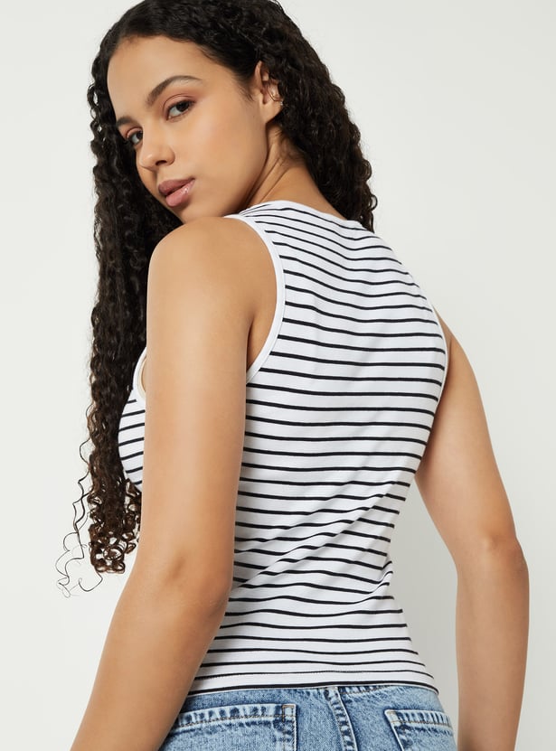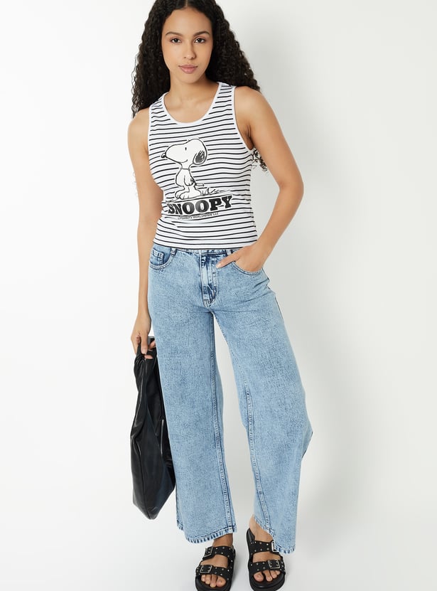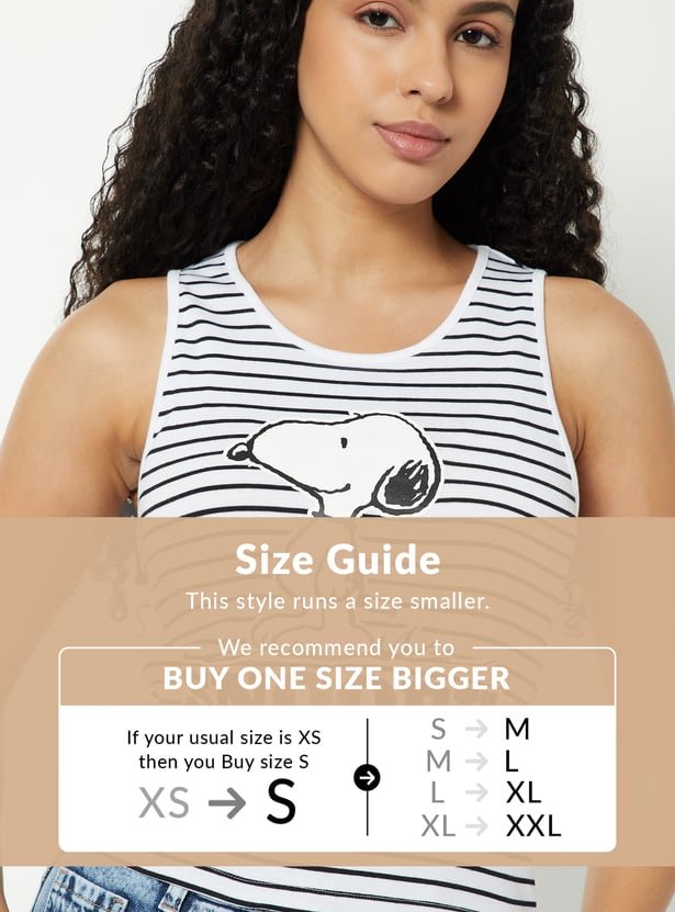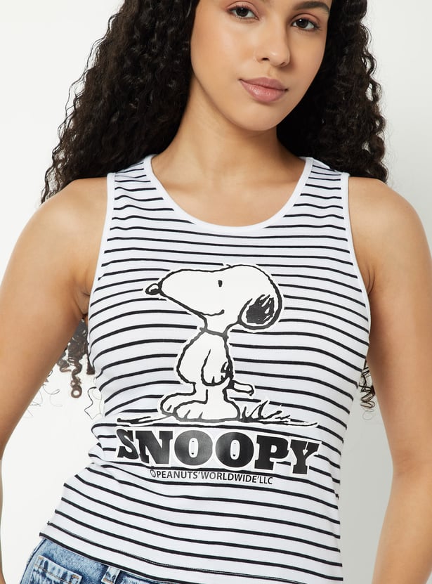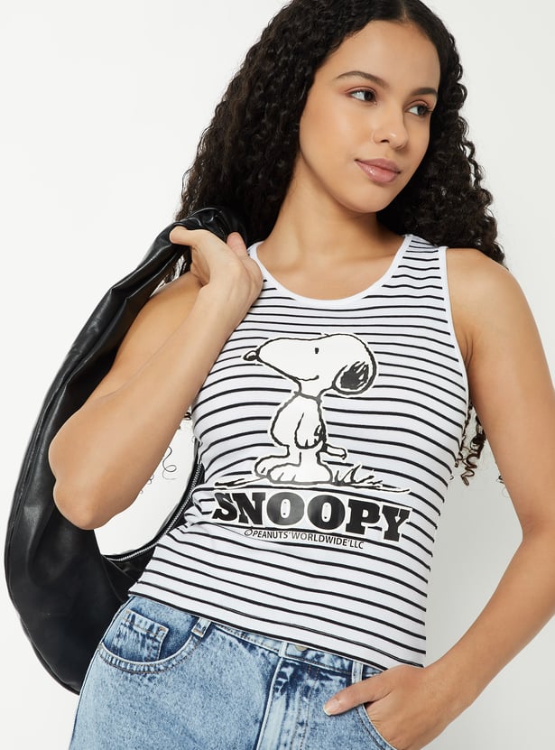 Add a playful touch to your wardrobe with this striped Snoopy tank top featuring a classic round neck and comfy half sleeves.