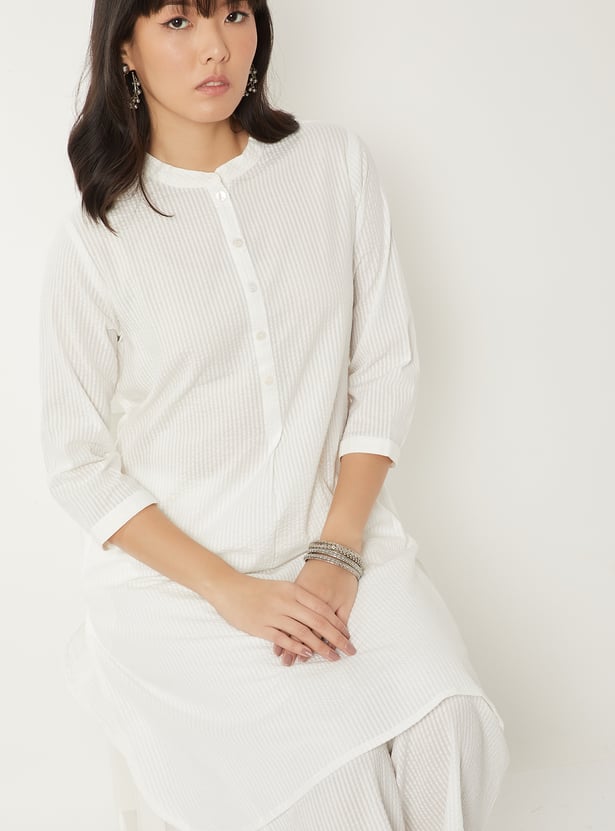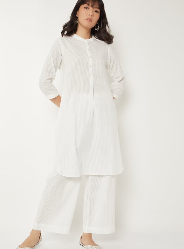 Step out in understated elegance with this striped straight kurta set. The kurta is designed with a smart band collar, button placket, 3/4th sleeves, and a functional side pocket for added ease. It is paired with palazzos featuring an elasticated waist, offering both comfort and a relaxed silhouette.
