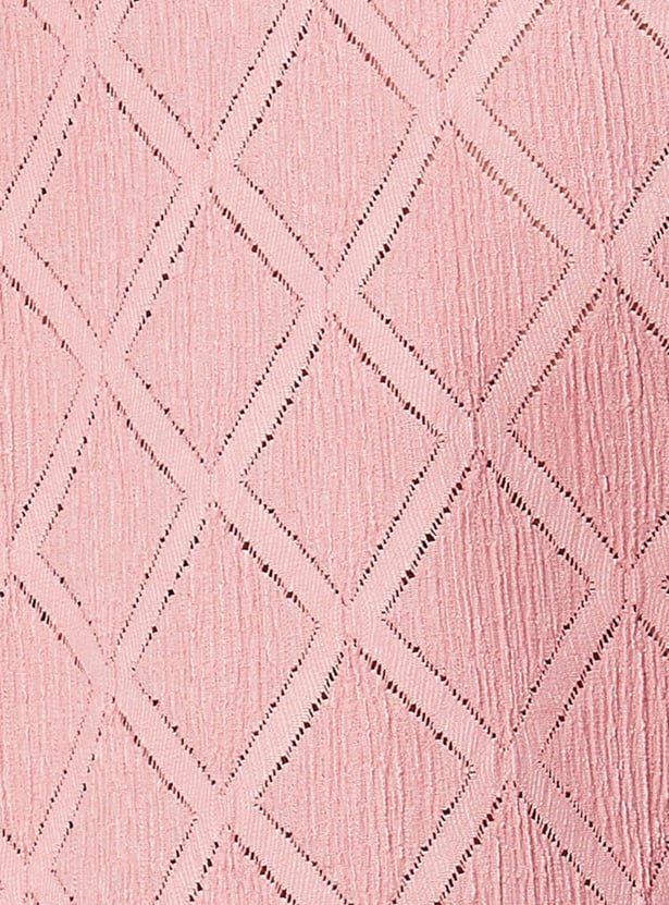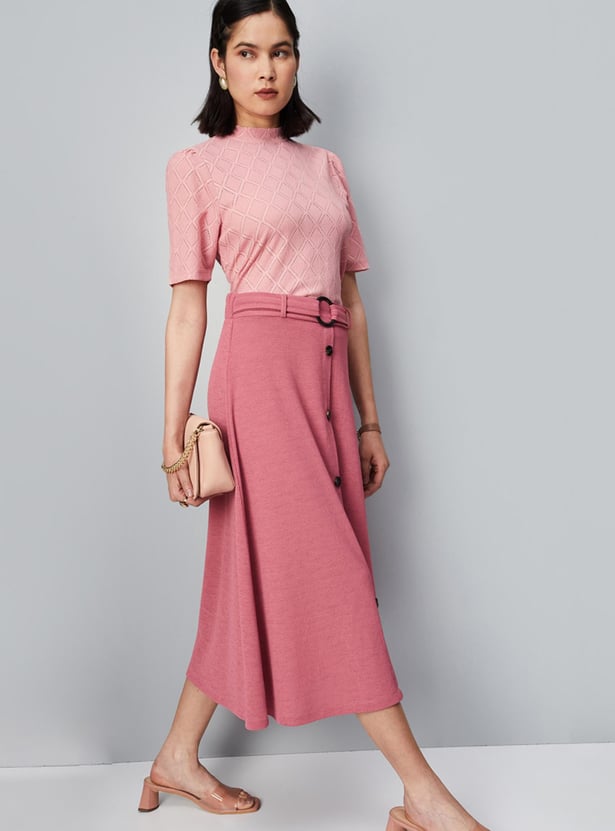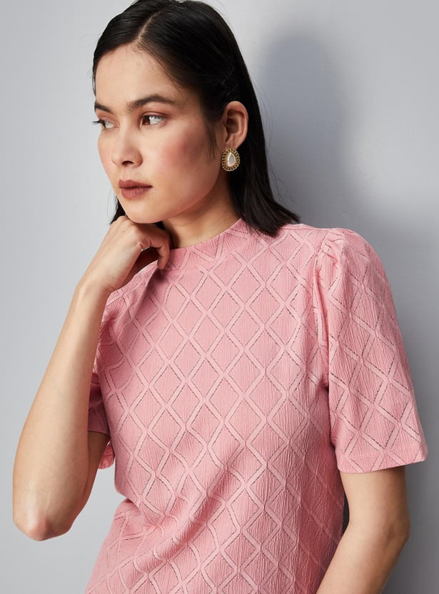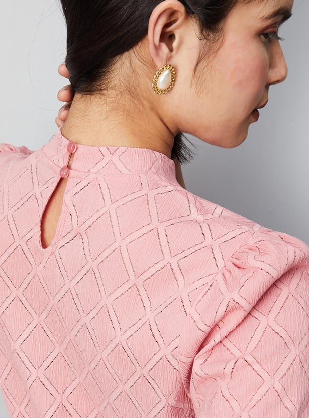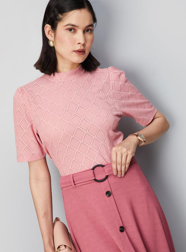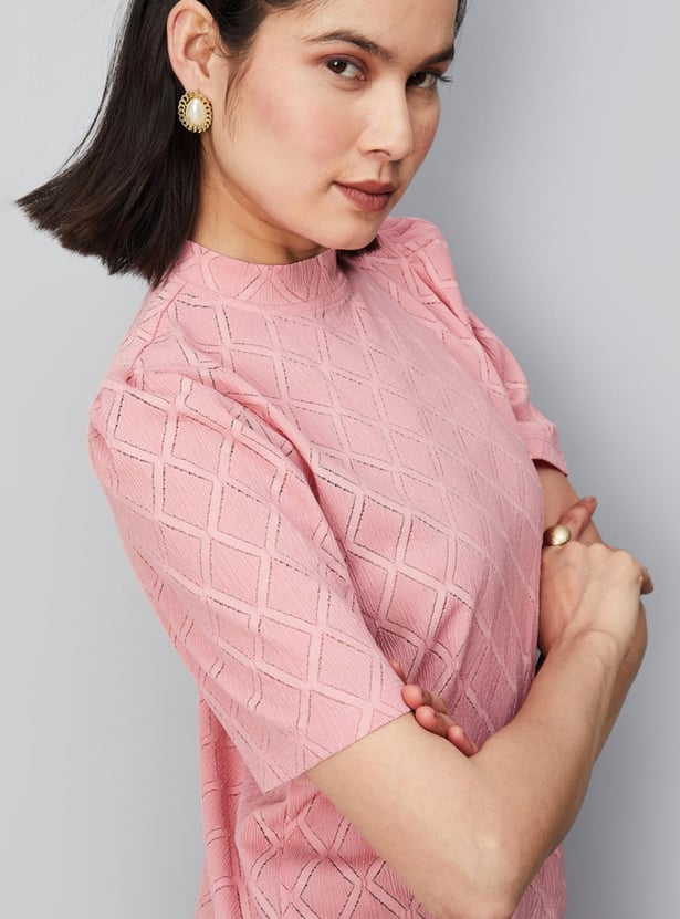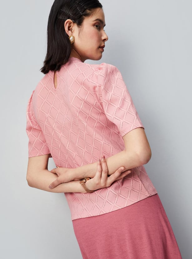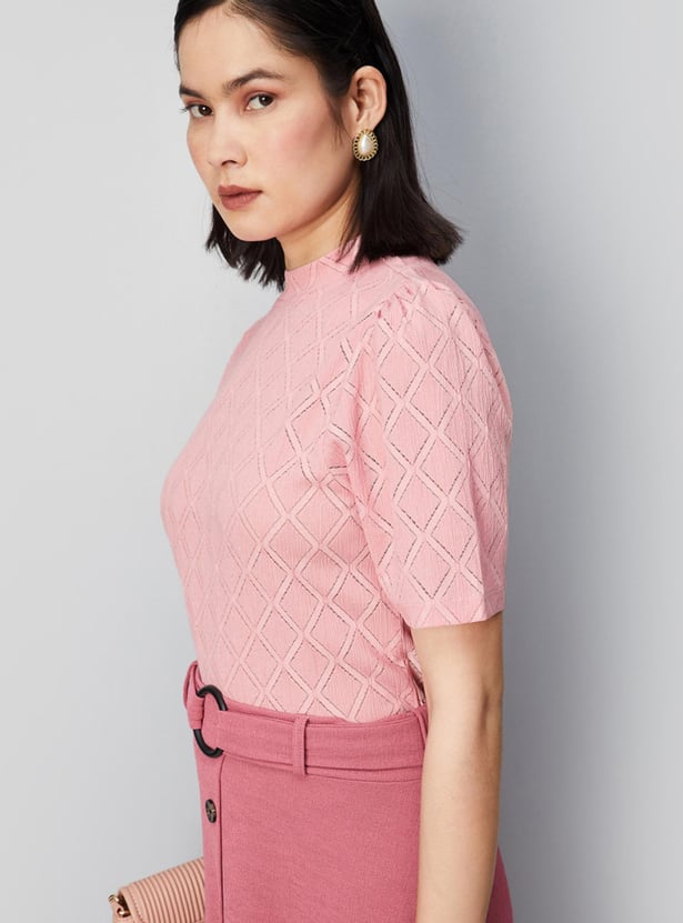 Switch up your casual style with this textured knit top. It is designed with a mock collar and half sleeves. It calls to be styled with a pair of trousers and flat sandals to elevate the outfit.