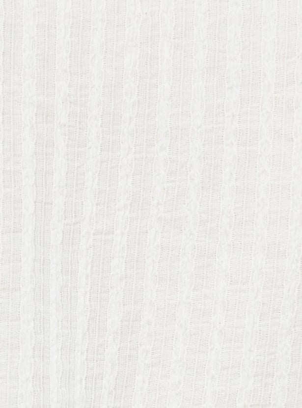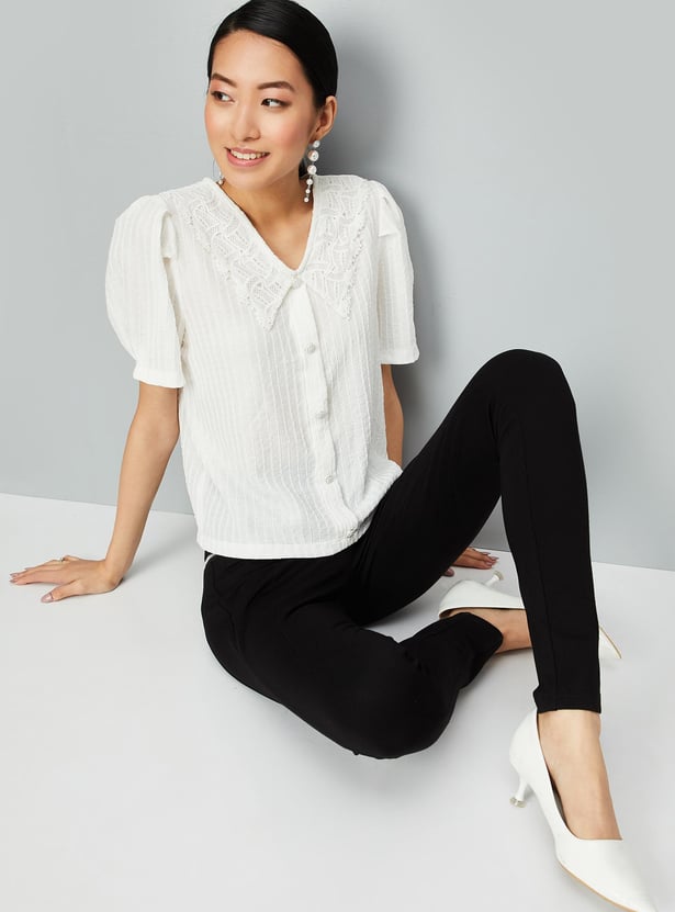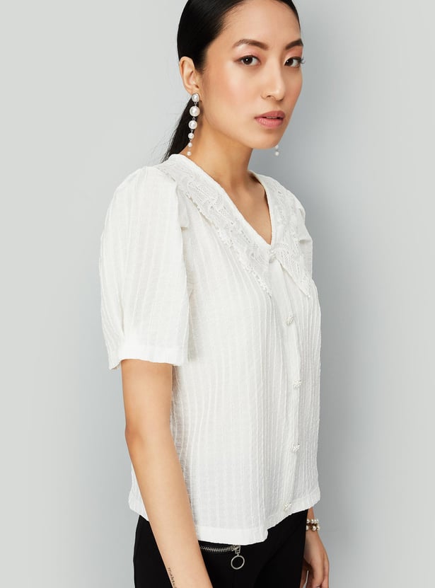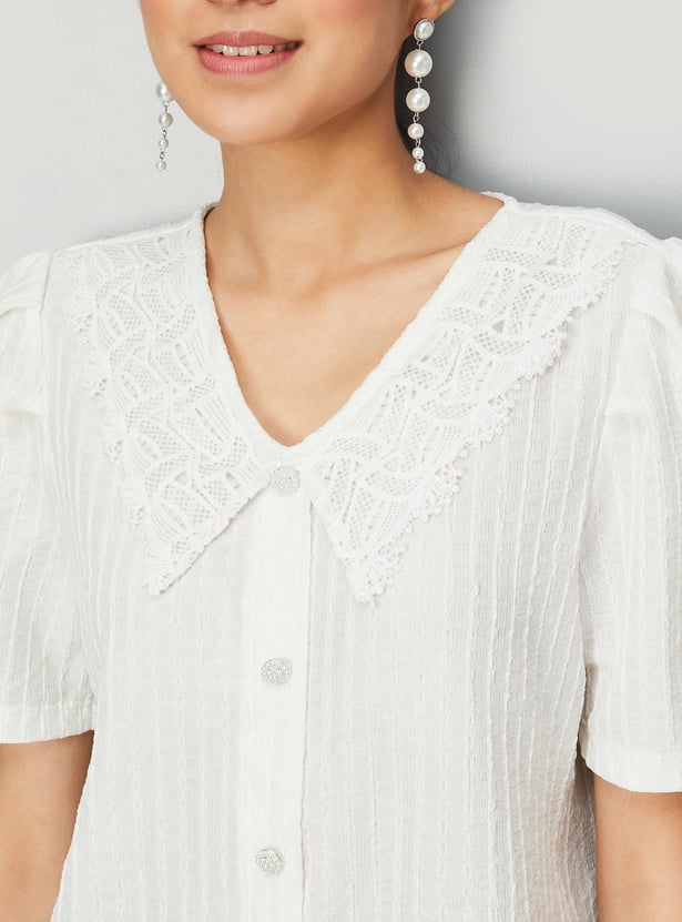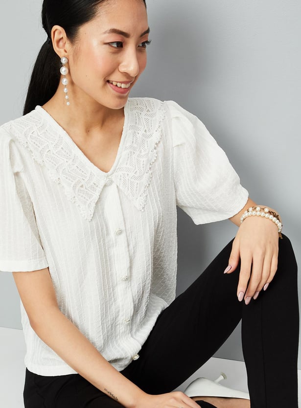 Upgrade your casual wardrobe with this unique top featuring half sleeves, a lace Peter Pan collar, embellished button detailing, and a straight hemline. This versatile top effortlessly transitions from casual to polished, adding a touch of sophistication to any ensemble. Model Size :