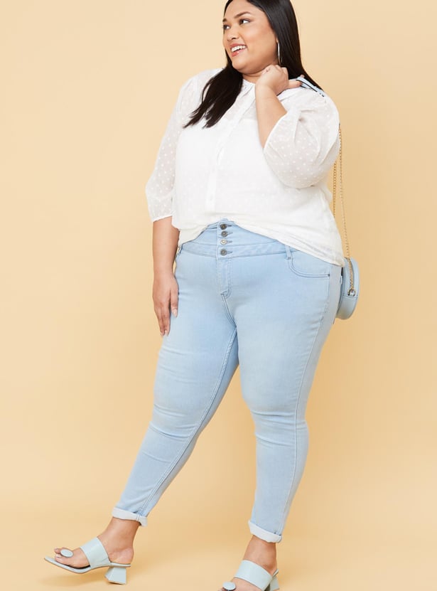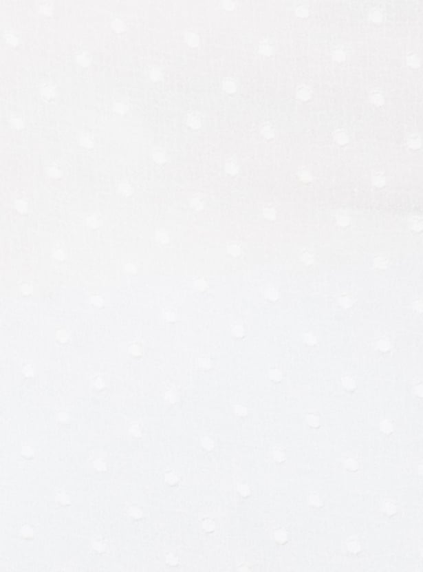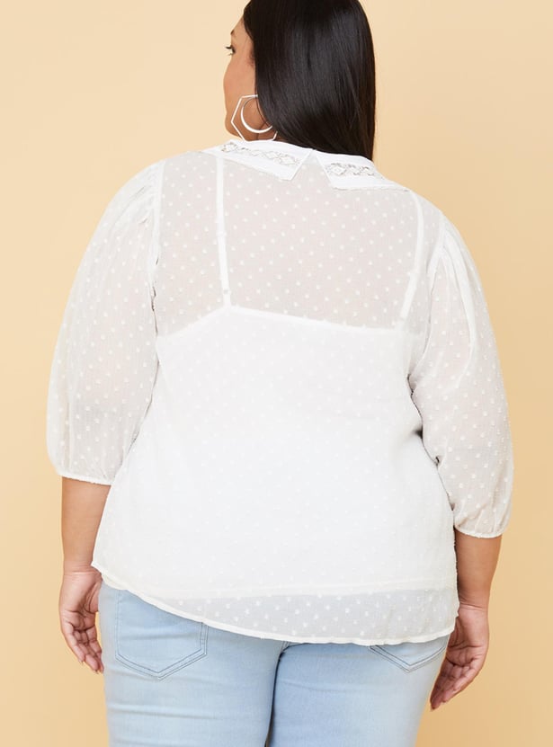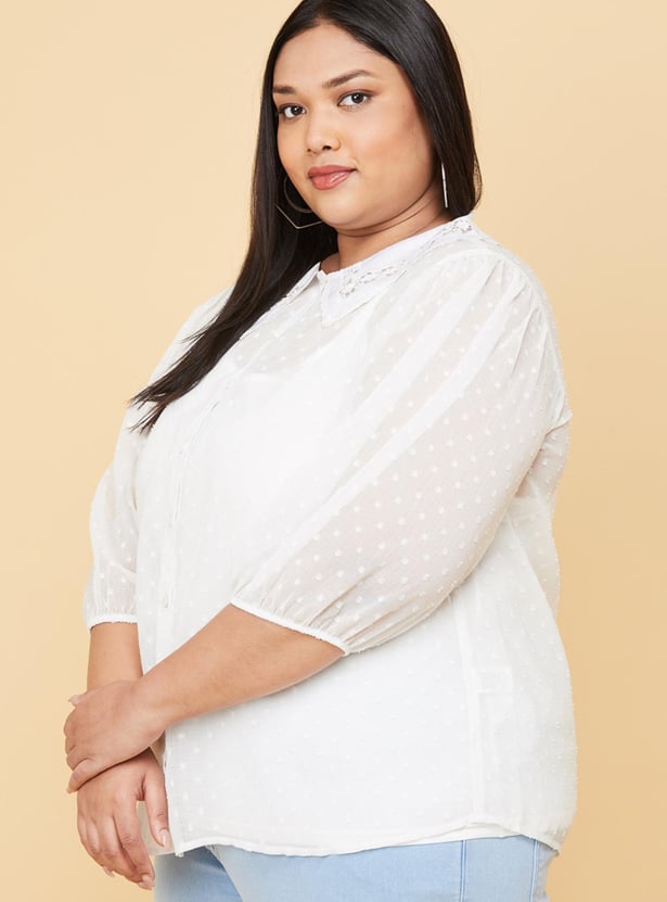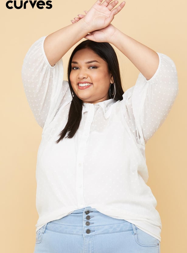 This top is defined by a textured surface, a collared neck and puffed sleeves.