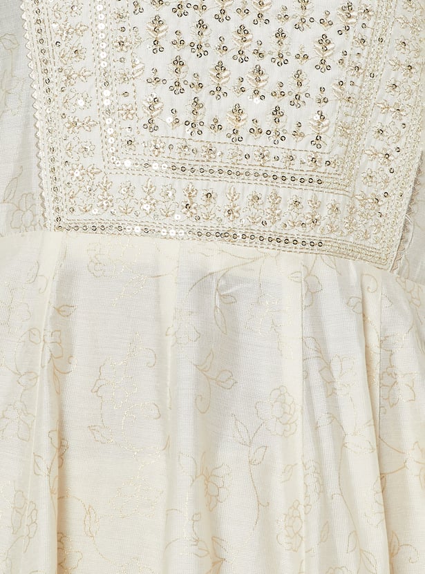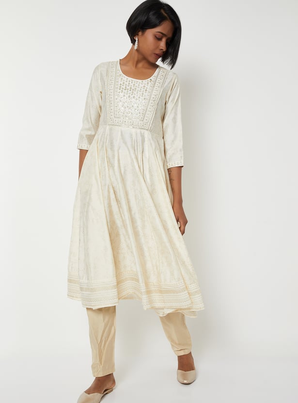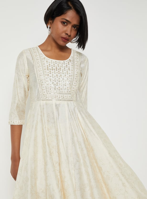 Add a touch of sparkle to your ethnic wear with this yoke embellished A-line kurta. Featuring sequins on the yoke, a classic round neck, and 3/4th sleeves, it offers a graceful silhouette with subtle shimmer for festive or casual occasions.