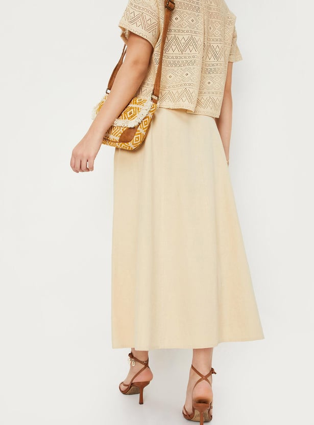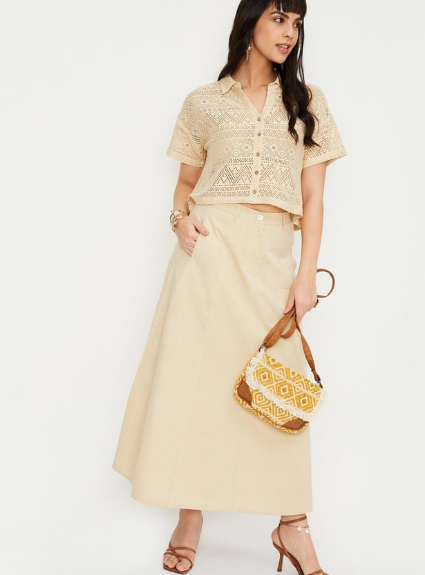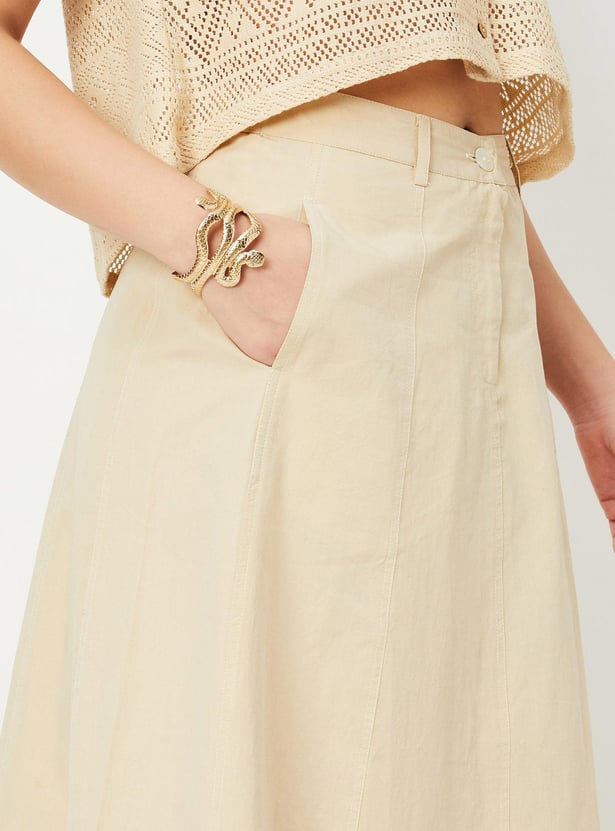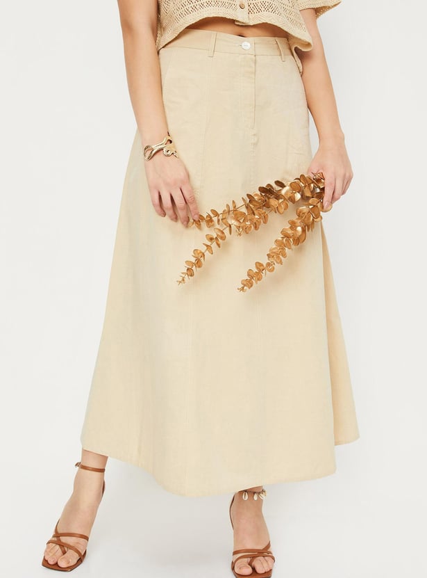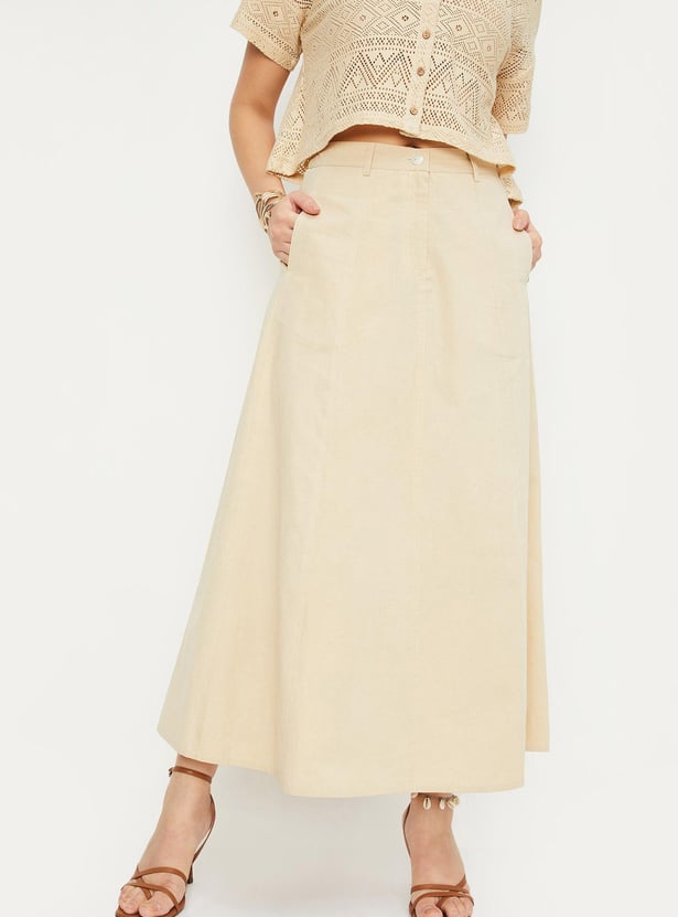 Up your style quotient with this A-line skirt featuring a panelled design. It has a belt loop waist, button and zip closure, side pockets, and a maxi-length profile. Style this skirt with a crop top and high heels for an elevated look.
