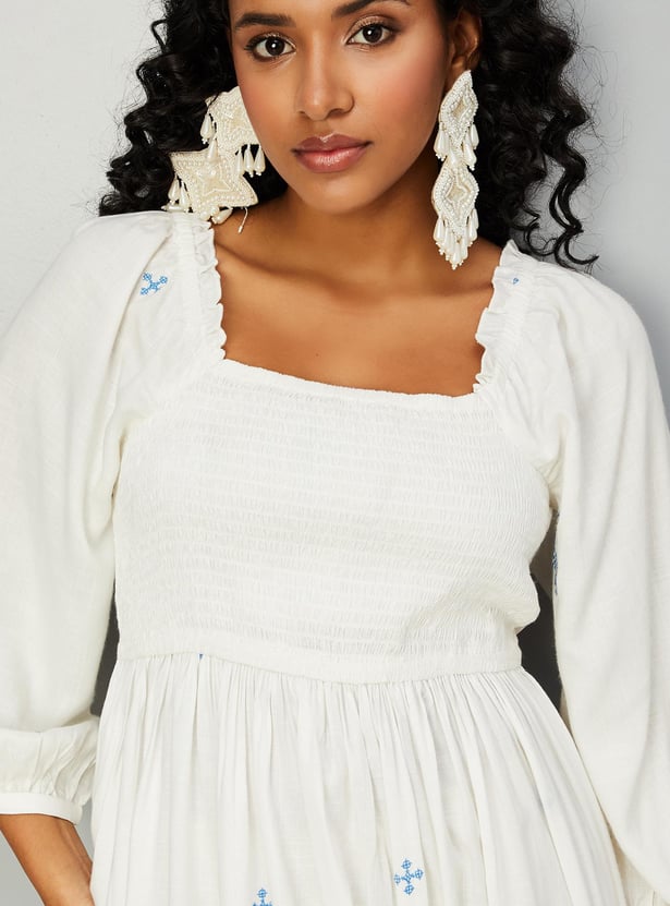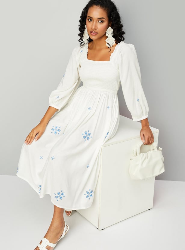 Keep your stylish edge intact with this chic casual dress. It features a square neck, three-fourth-length puffed sleeves, and a smocked top that effortlessly combines fashion and comfort. The all-over embroidered design, along with the regular fit and midi length silhouette, makes it an ideal choice for women who prioritize both design and comfort in their wardrobe.
