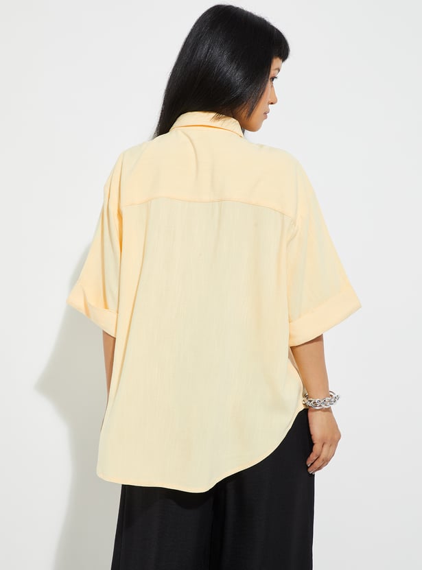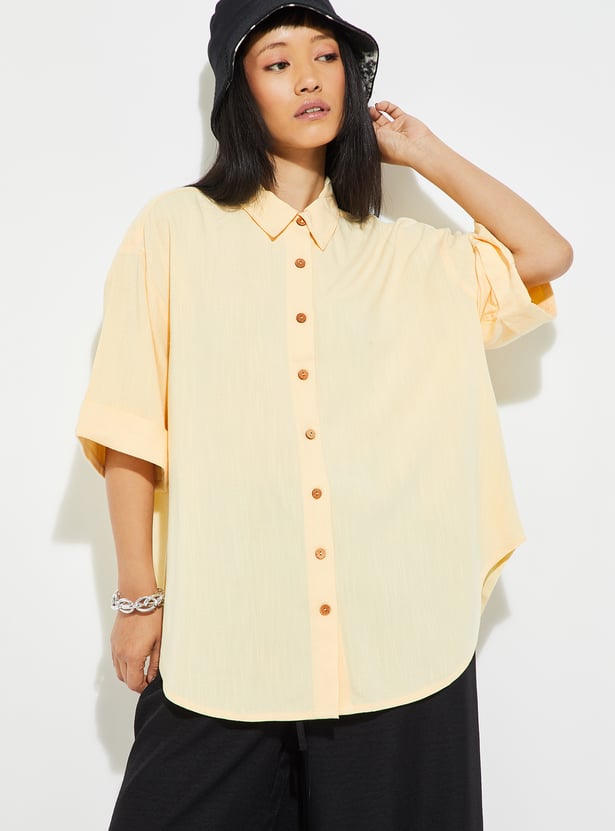 Elevate your casual wardrobe with this shirt. Designed with a spread collar and half sleeves, it features drop shoulders for a relaxed look. The curved hem adds subtle elegance.