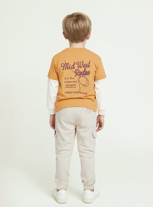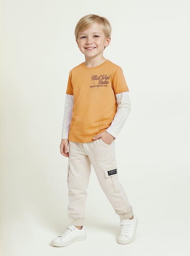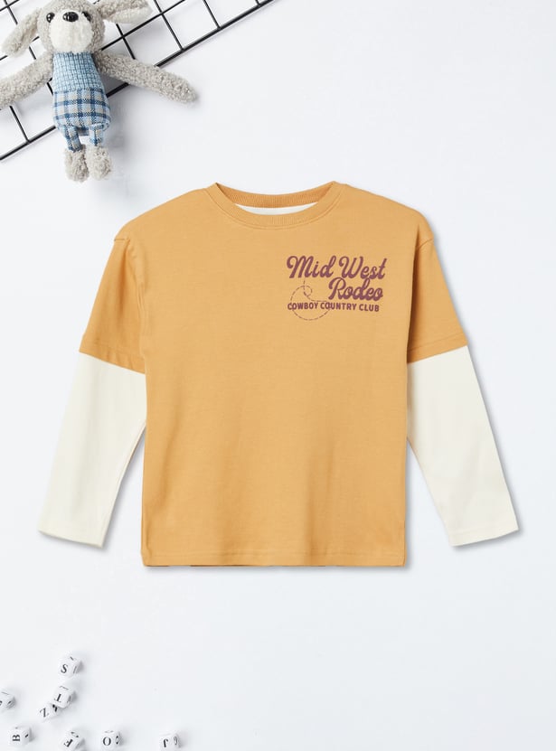 Make a bold statement in this colourblock oversized T-shirt. Featuring a classic crew neck, full sleeves, and a striking chest print, it’s the perfect blend of relaxed comfort and standout style.