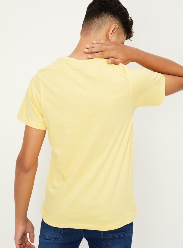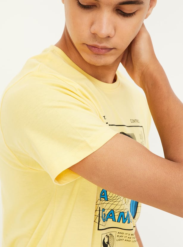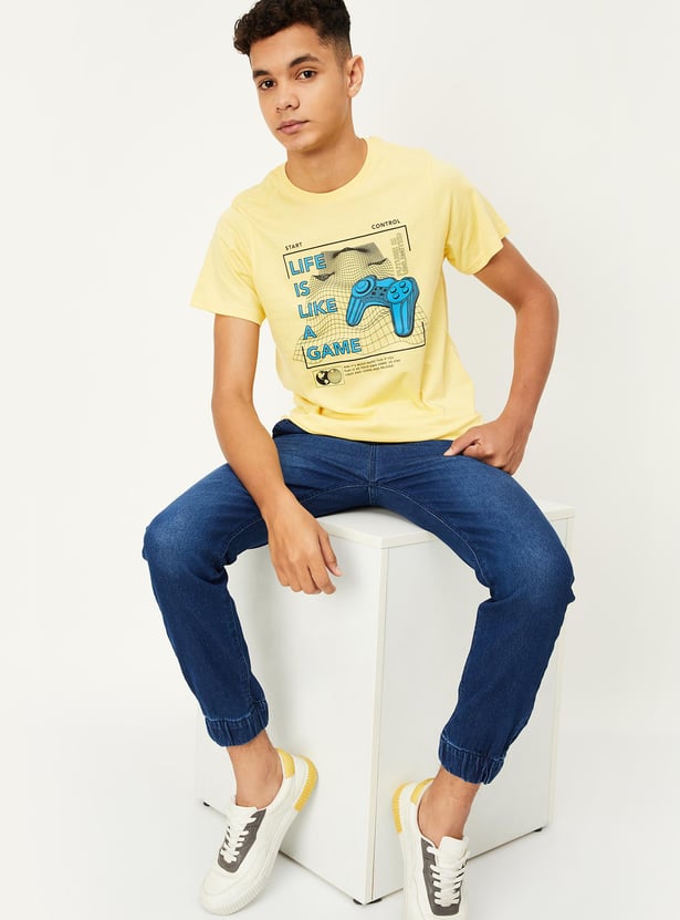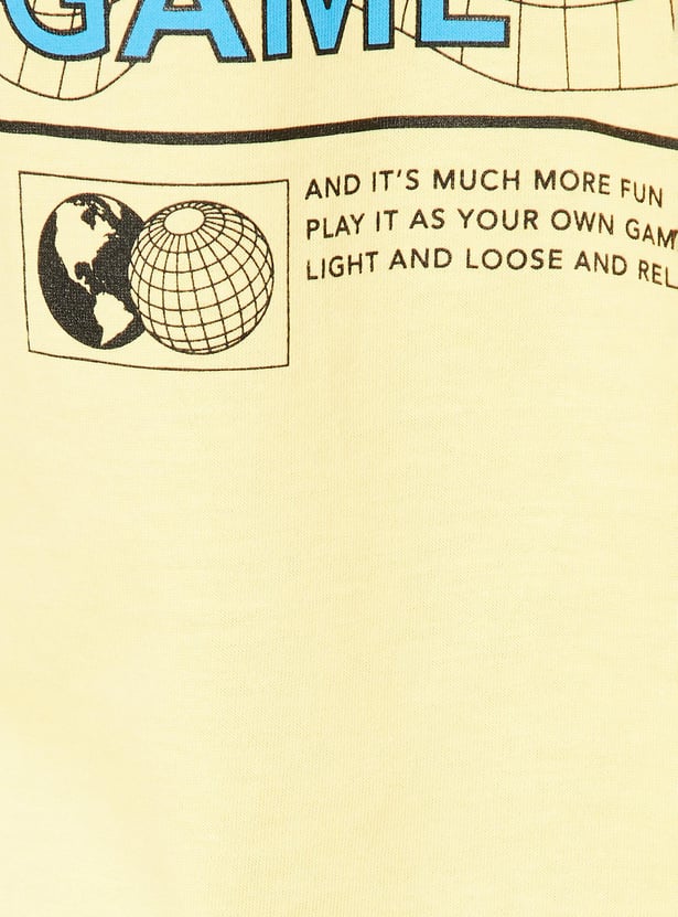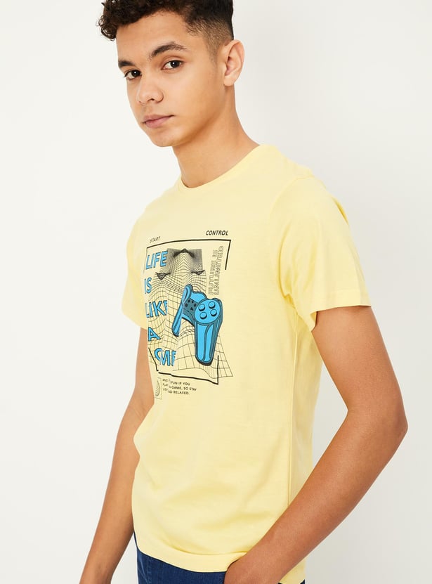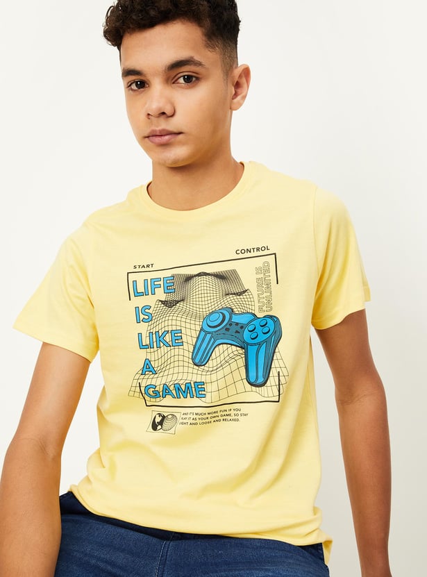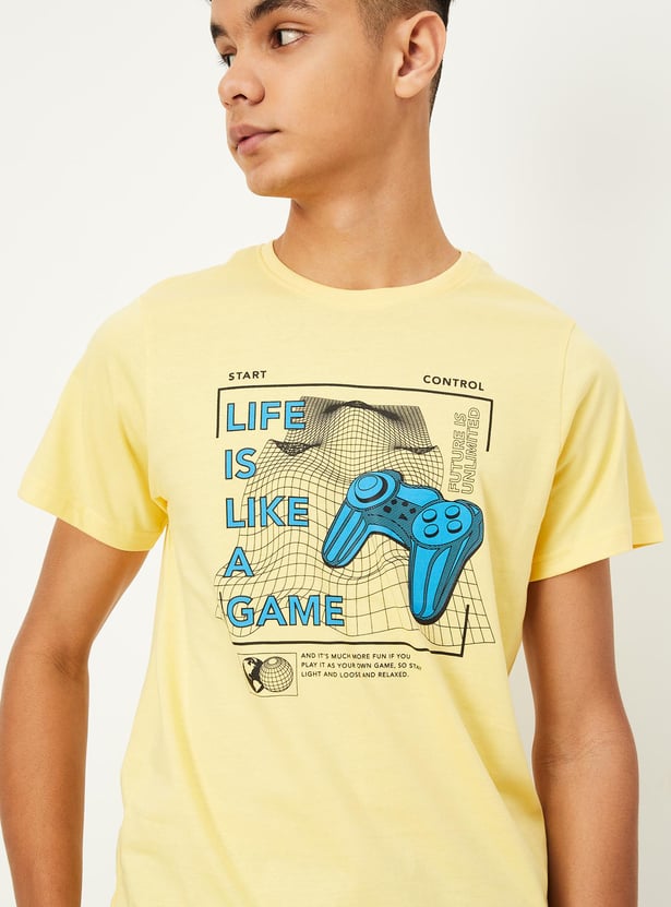 Add a fun twist to your kid's casual wardrobe with this T-shirt. It is styled with a graphic print, a crew neck, and half-sleeves