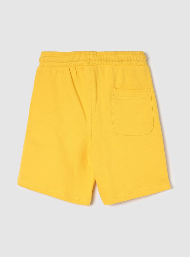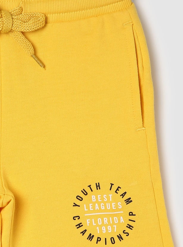 Liven up his summer wardrobe with this pair of shorts. It is designed with a ribbed waist with drawstrings, insert pockets, a back patch pocket, and a typographic print above the hem.
