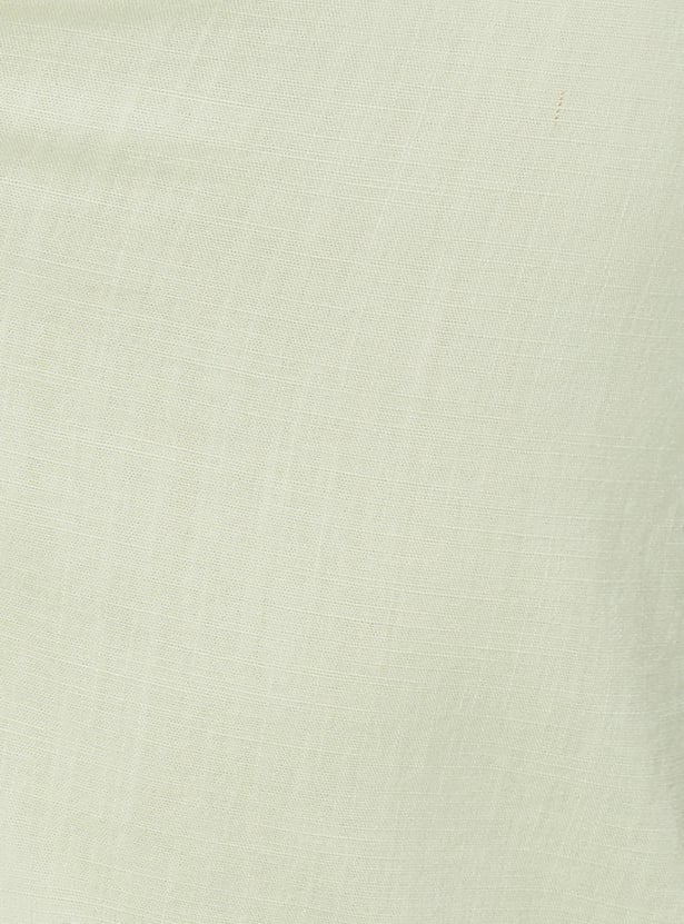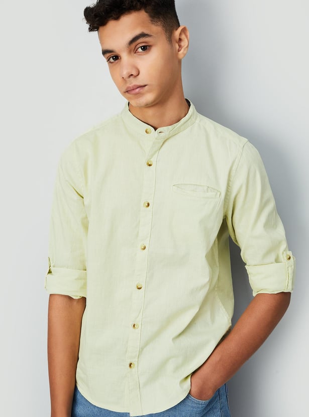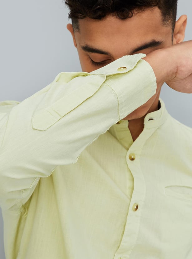 Create effortlessly cool and smart outfits with this shirt. The band collar, full sleeves with roll-up tabs, a welt pocket, and a curved hem lend a classic look.