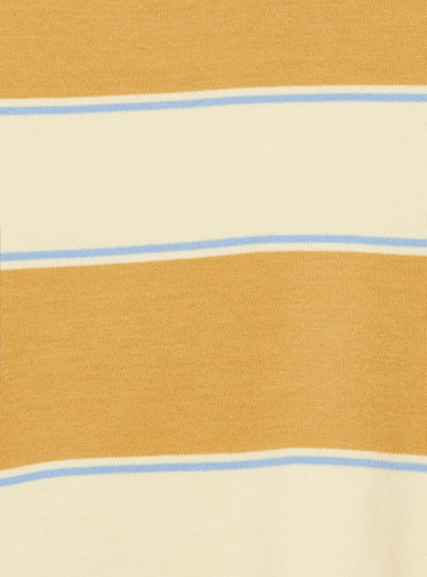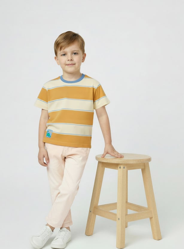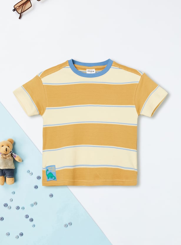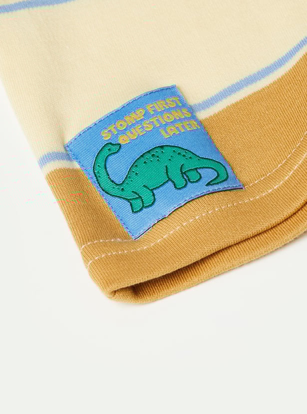 Refresh his everyday essentials with this striped T-shirt, designed with a contrasting crew neck and comfortable half sleeves for effortless wear. The timeless stripe pattern and dino patch add a sporty, versatile touch, making it easy to style for any casual outing.