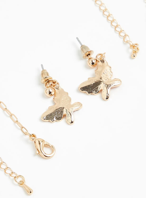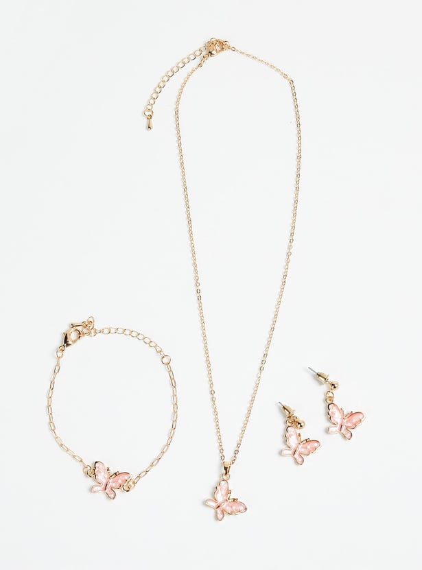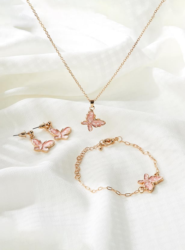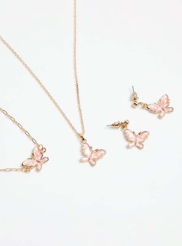 Make her outfit pop with this jewellery combo set. Made of metal, it includes a butterfly pendant necklace with polka dots, a lobster clasp, and a pair of drop earrings with post and back closure. The chain-link bracelet comes with a matching charm and a lobster clasp.