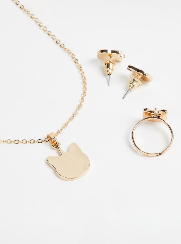 Amp up her cuteness factor with this jewellery combo set. It is made of metal with cat motifs for an adorable look. This set includes a pendant necklace with a lobster clasp and a pair of stud earrings with post and back closure. The adjustable ring completes this set.