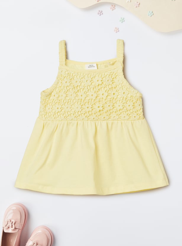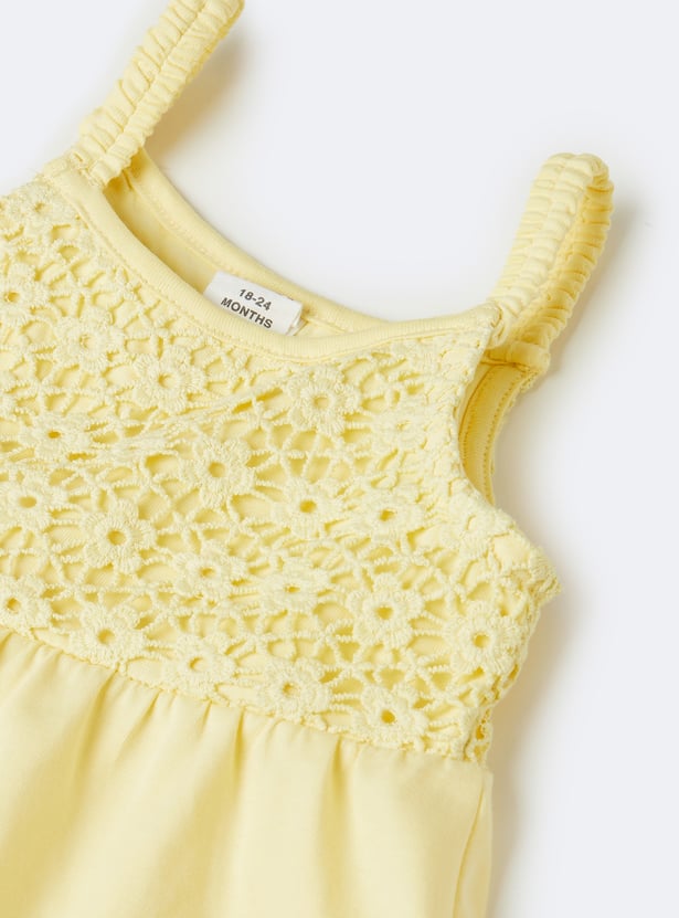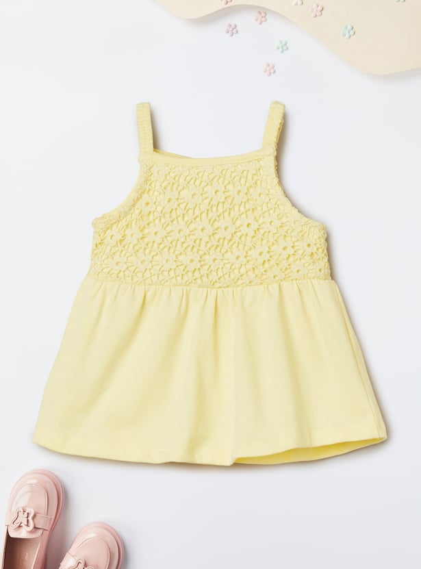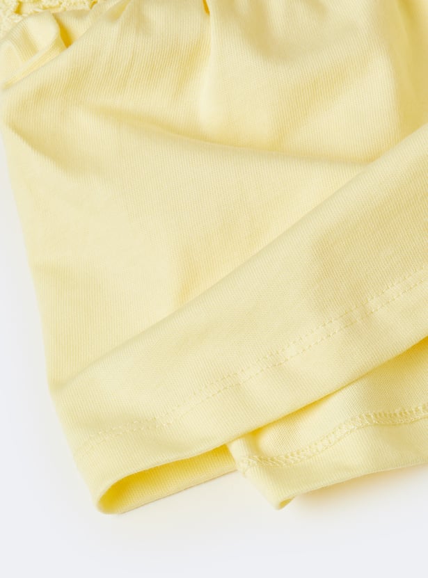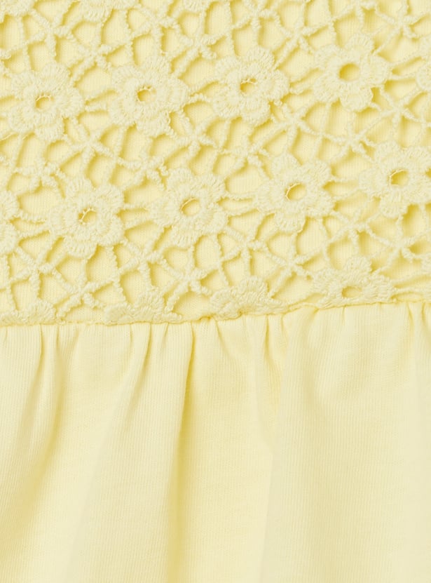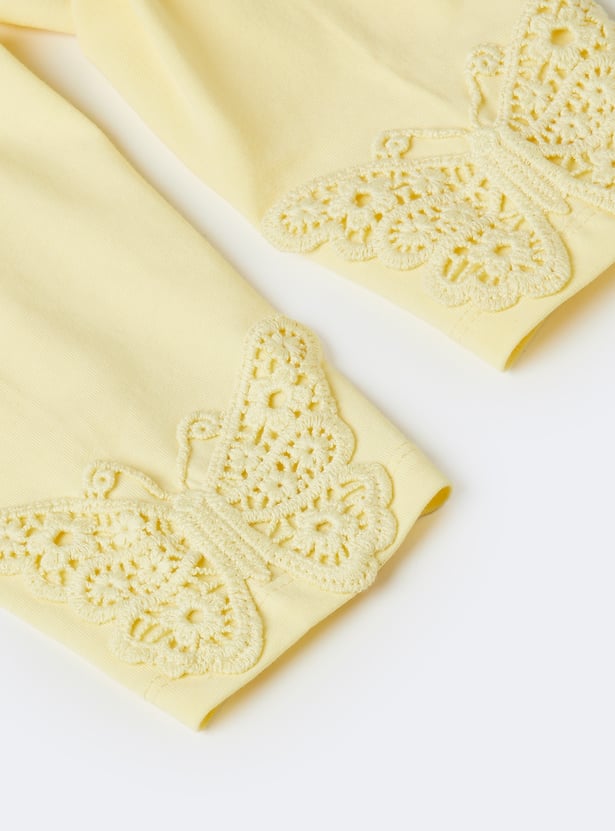 This crochet shorts set blends charm and comfort with a sleeveless top featuring a square neck and matching leggings designed with an elasticated waist. A sweet butterfly embroidery at the hem adds a playful, delicate touch to the breezy set.