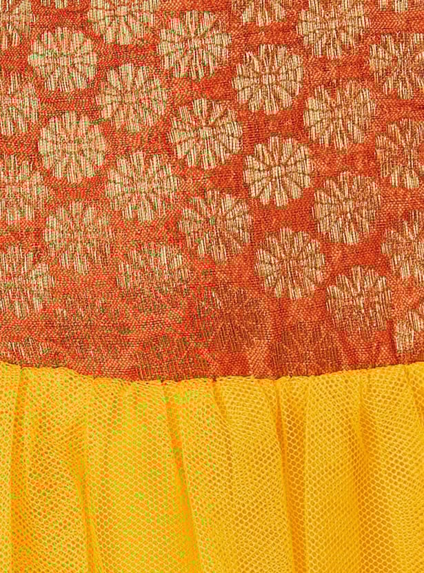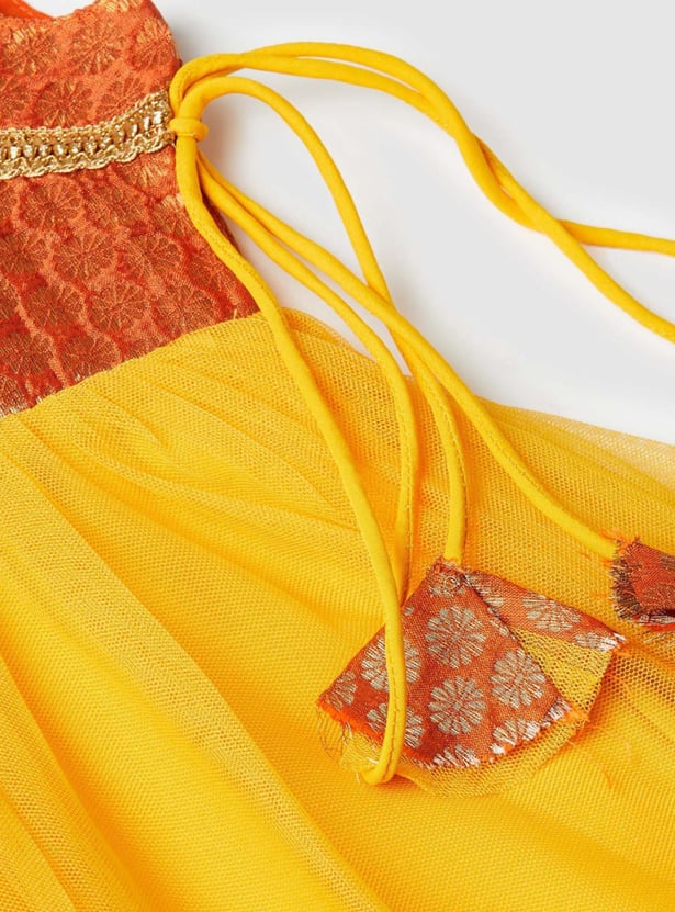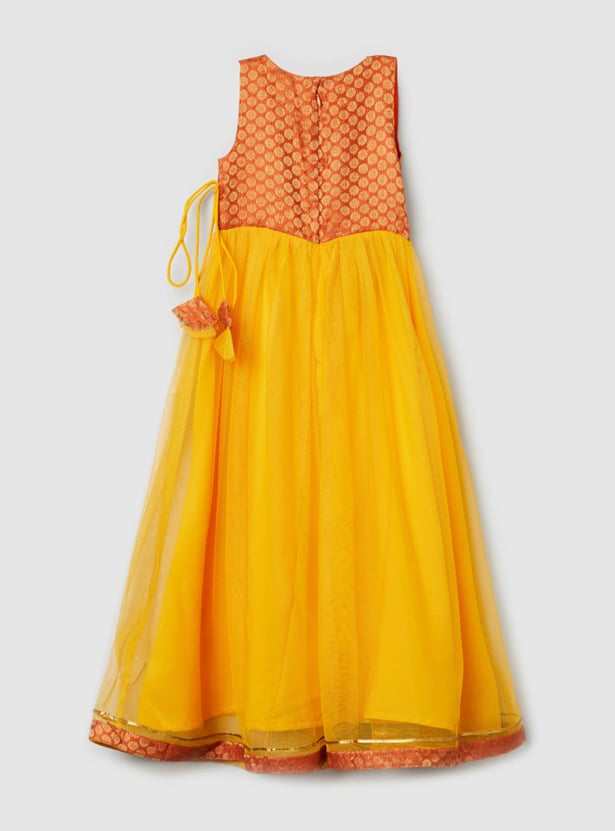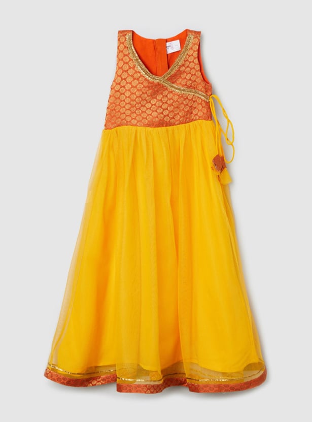This chic ethnic dress is characterized by an embroidered surface, a sleeveless construction with a V-neckline, tassel detailing and a zip closure, giving a perfect look to your little one.