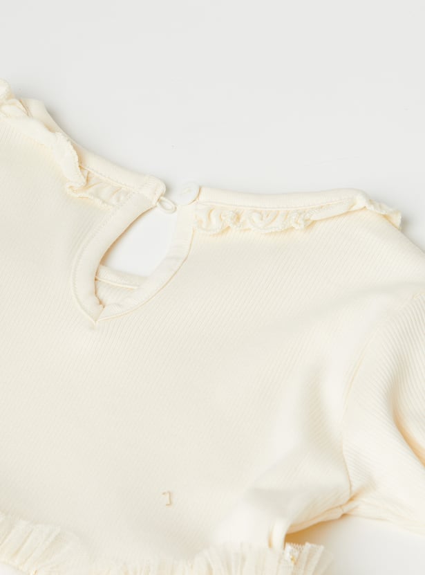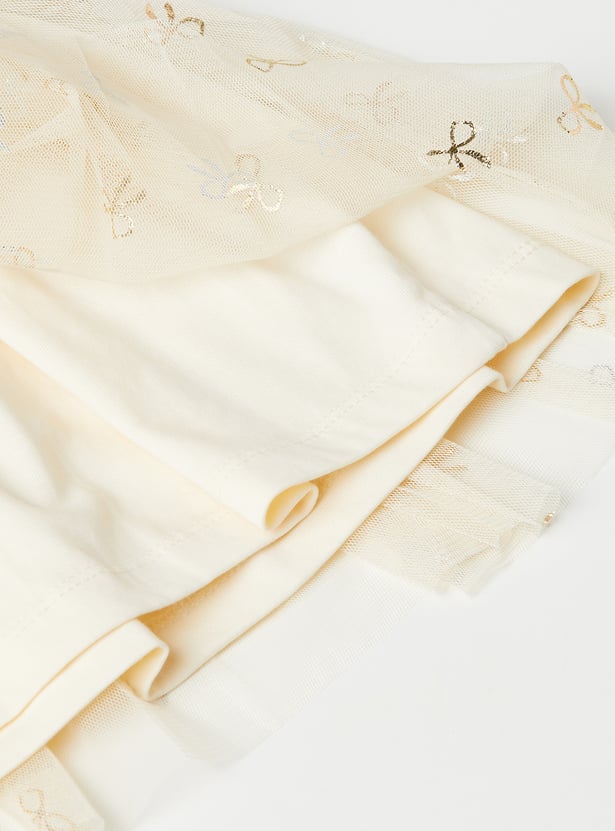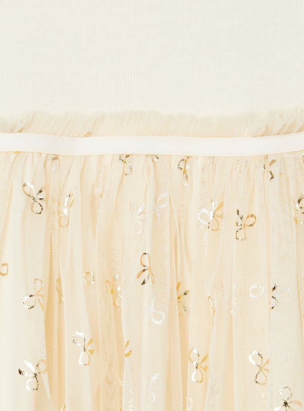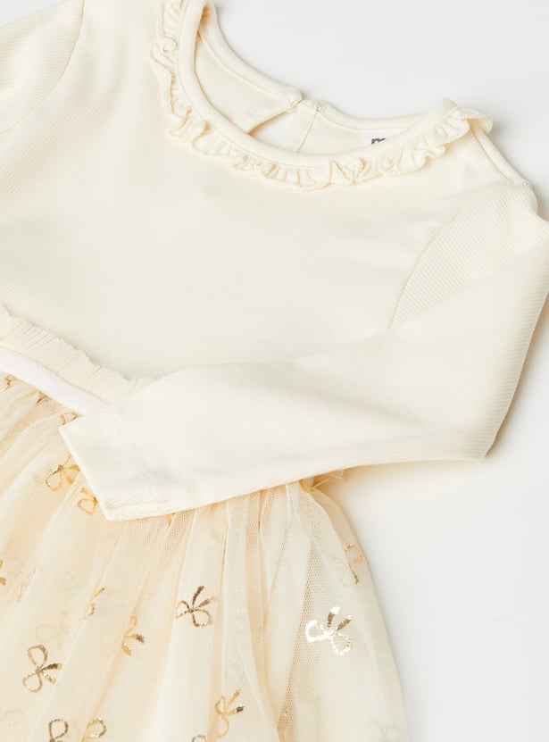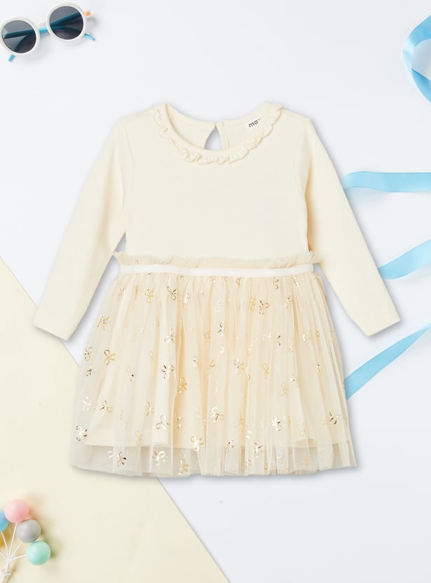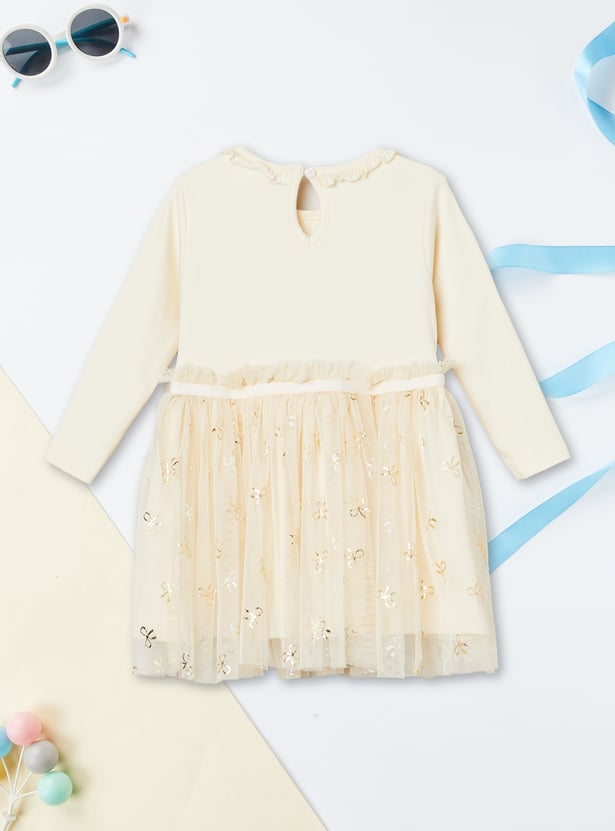 Shine with subtle glamour in this foil print dress, perfect for day-to-night transitions. It features a round neck, full sleeves, and a button closure, with a ribbed upper that flows into a flared hem skirt for a flattering silhouette.