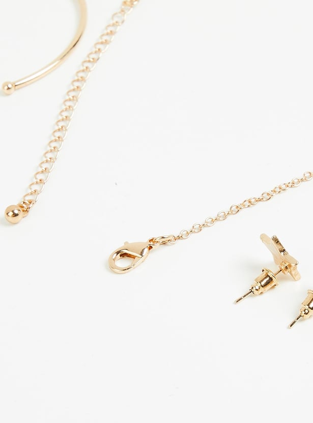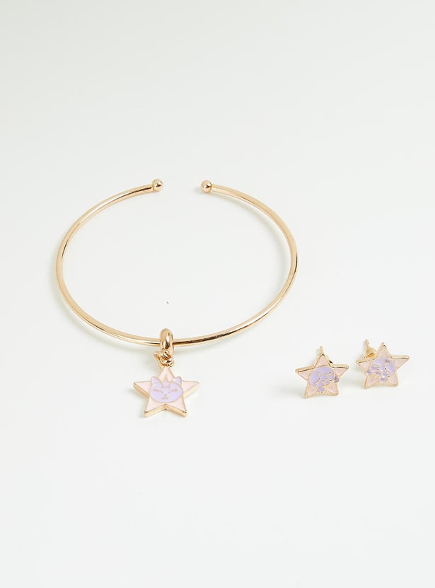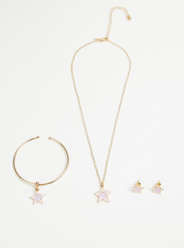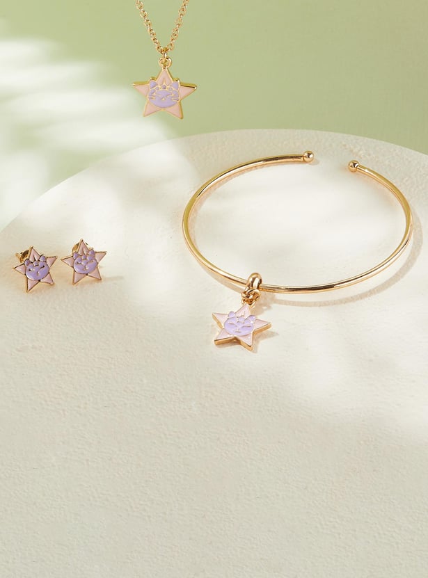 This jewellery set includes a necklace with a star-shaped pendant secured with lobster closure, a pair of stud earrings, and a bracelet with a charm. Your child would look adorable while wearing this jewellery set.