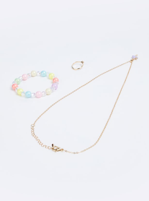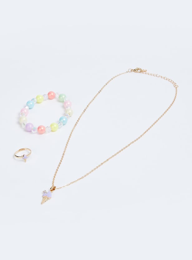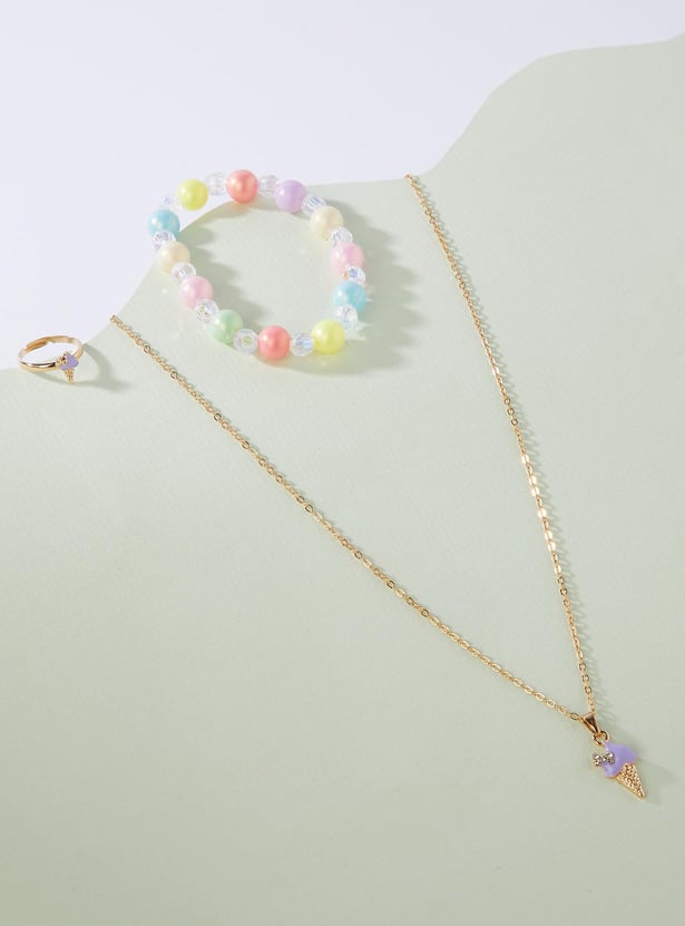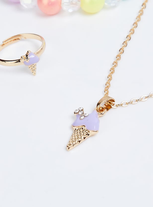 Indulge your little one's sweet tooth with this delightful jewellery set. Featuring an ice cream-shaped pendant necklace with a secure lobster closure, a charming beaded bracelet, and an adjustable ring, it's the perfect accessory for adding a touch of whimsy to any outfit. Watch your child shine with cuteness and style.