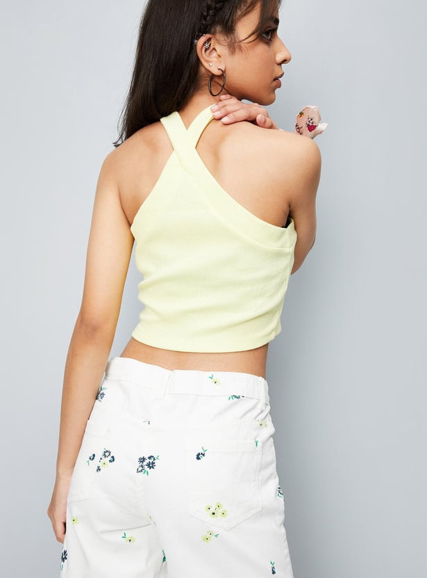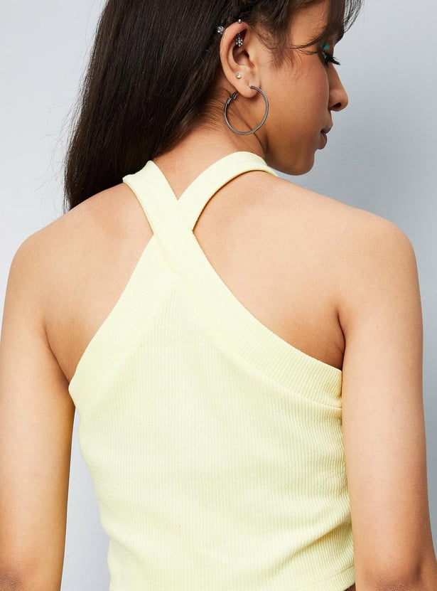 For a fashion-forward look, add this crop top to her wardrobe. It has twisted straps, sleeveless construction, and a rib-knit design. Pair this top with shorts and sneakers for a summer-ready look.