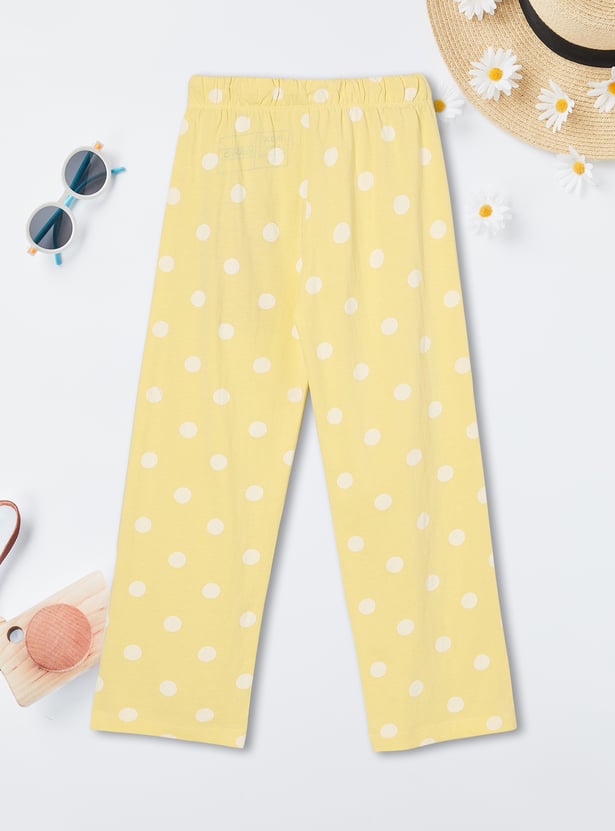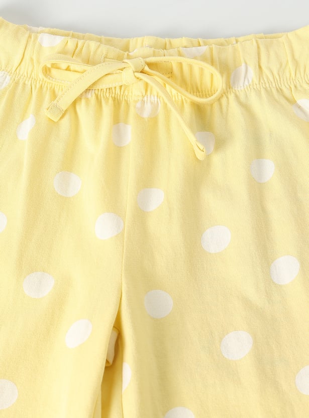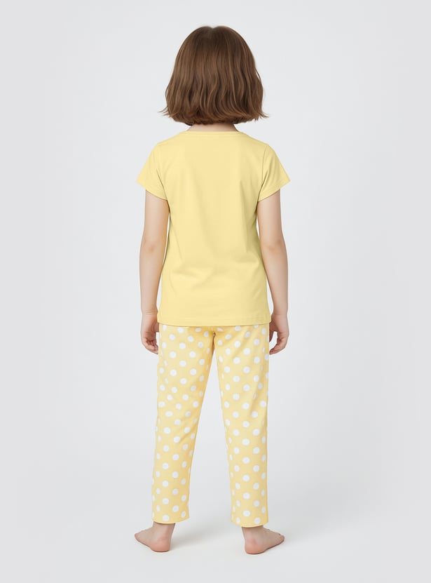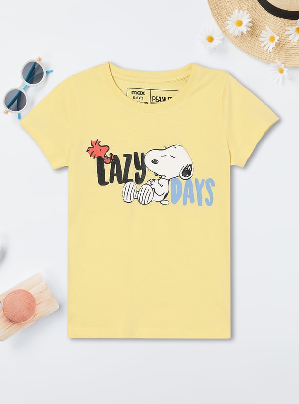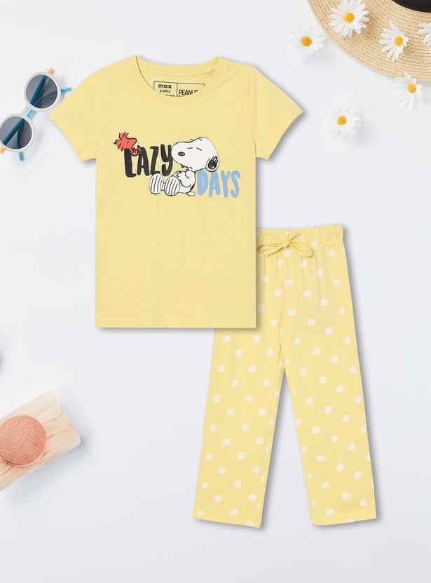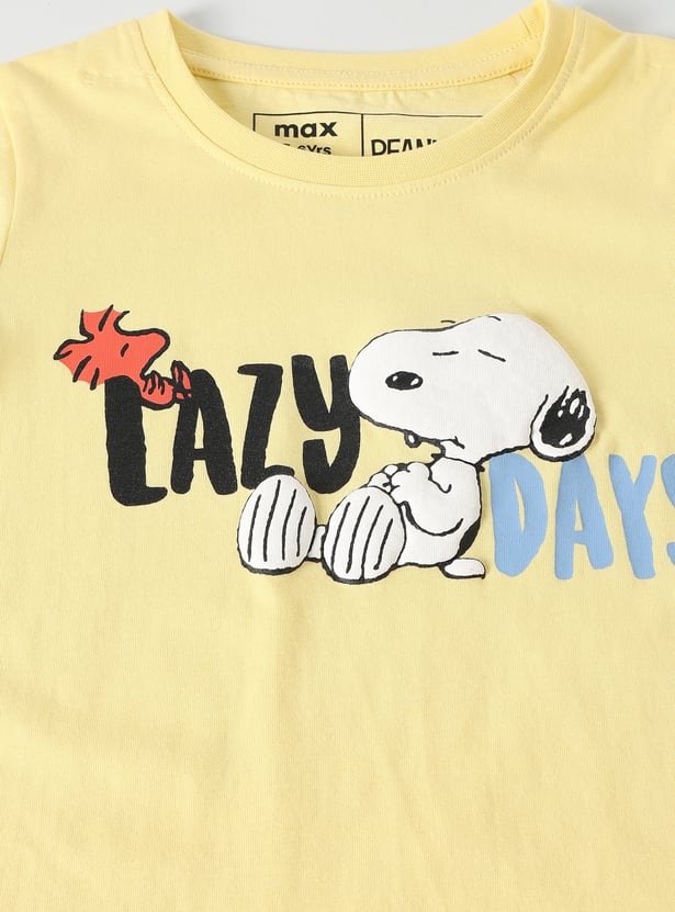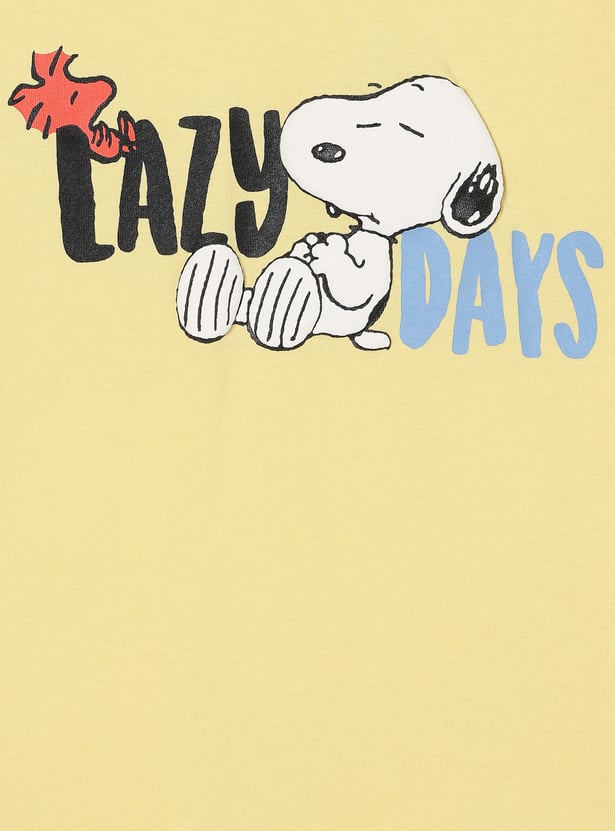 This PJ set features a playful Snoopy print t-shirt with a round neck and half sleeves, paired with comfortable pyjamas that have an elasticated waist with drawstring closure for the perfect fit.