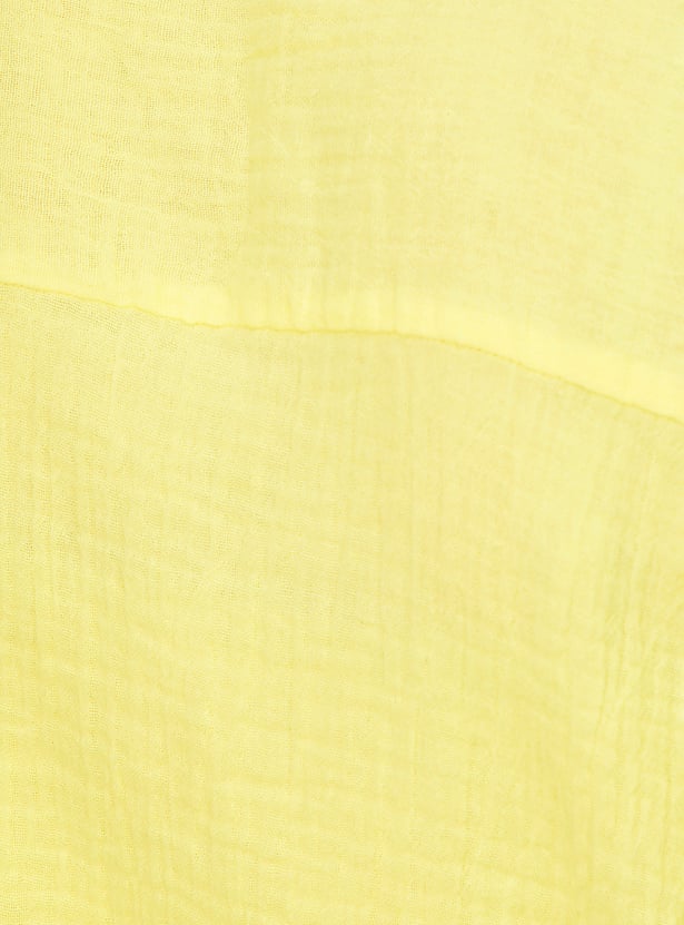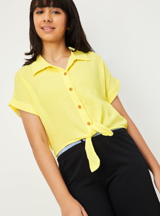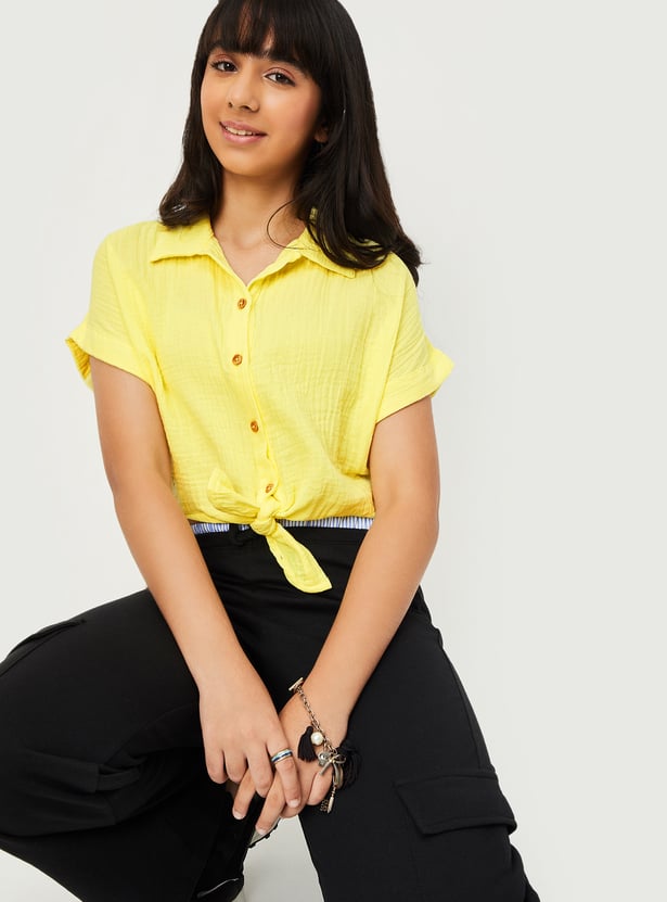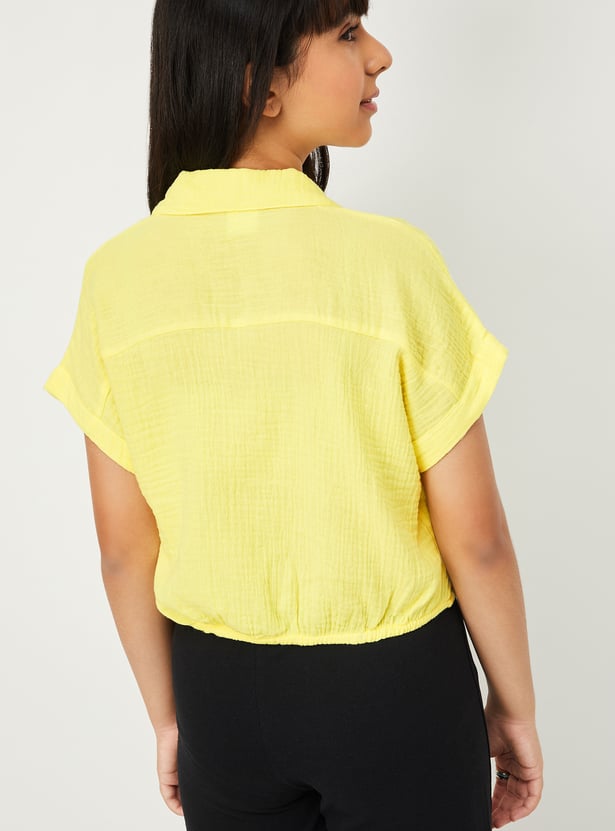 This textured shirt-style top blends classic design with a playful twist. Featuring a spread collar, button placket, and half sleeves, it’s finished with a tie-up hem that adds a touch of effortless charm to your everyday style.