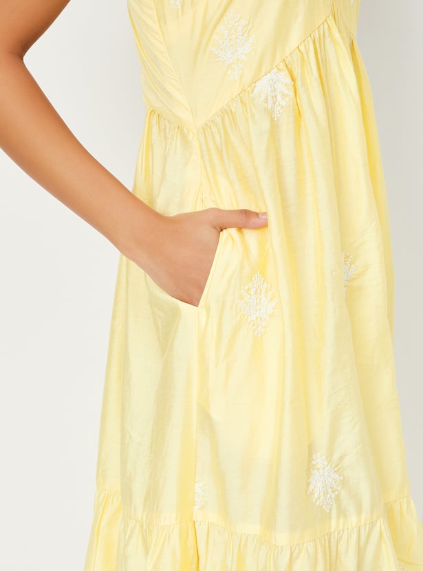 Ready to turn heads at your next event? This embroidered A-line midi dress with a sweetheart neckline and shoulder straps is your perfect pick. With delicate embroidery and side pockets, it blends style and functionality effortlessly!