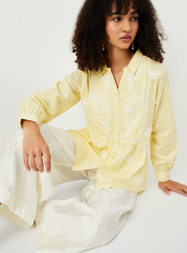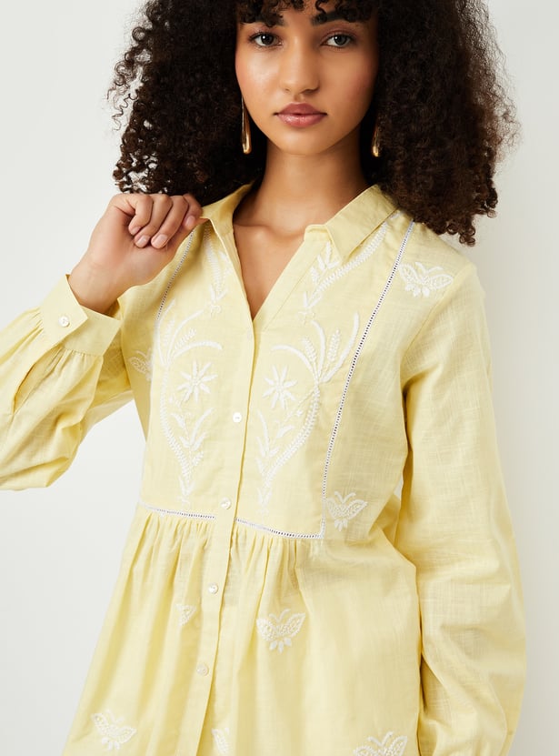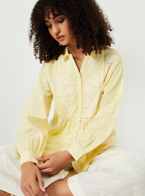 This embroidered shirt tunic adds a touch of elegance to your everyday wardrobe. Featuring a spread collar, button placket, and full sleeves with button cuffs, it’s the perfect blend of sophistication and comfort.