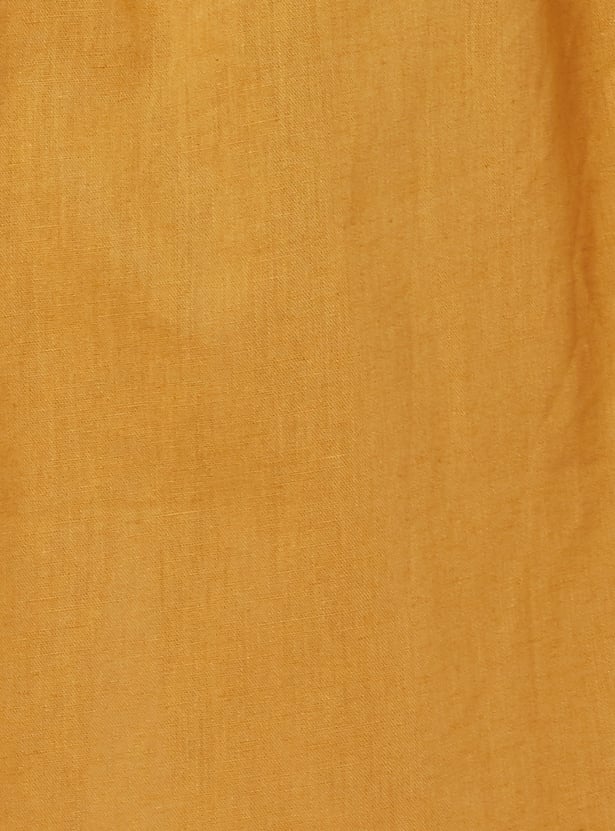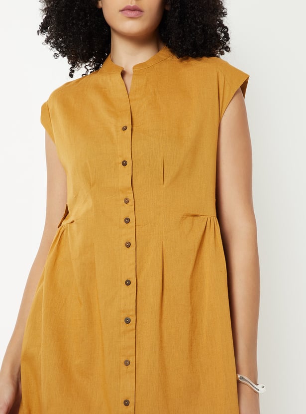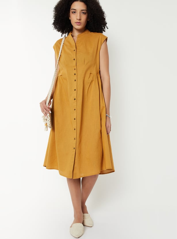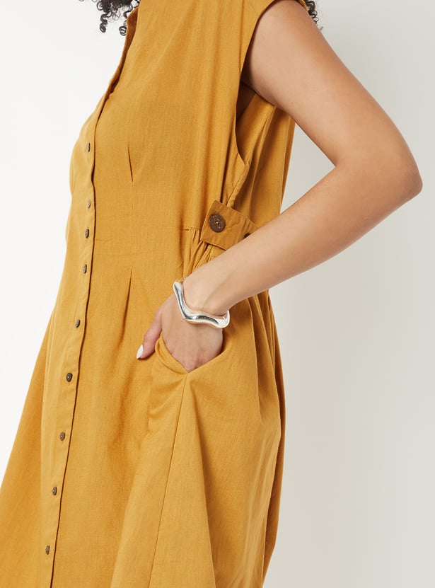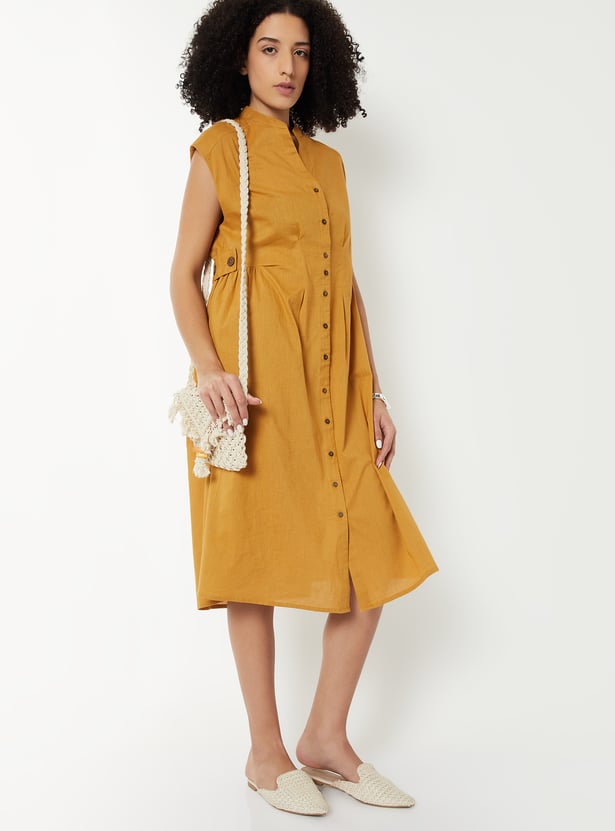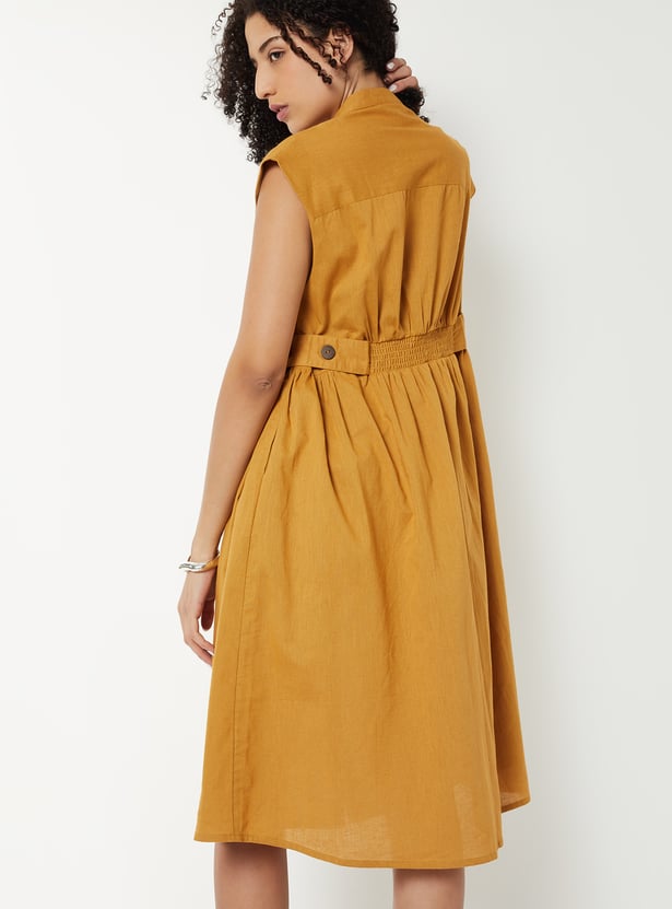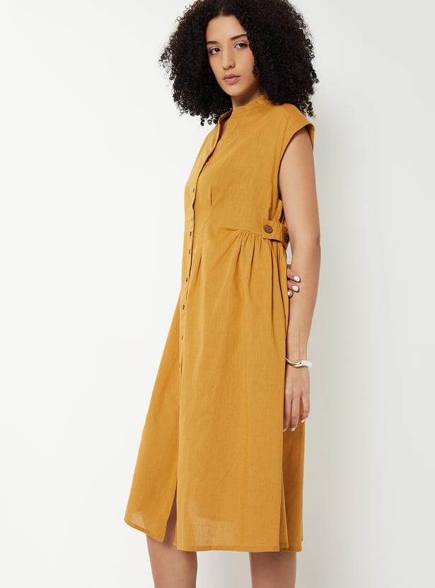 Elevate your everyday elegance with this solid sleeveless midi dress. Featuring a band collar, elasticated waist detailing, side pockets, and button placket, it offers refined comfort and effortless style.
