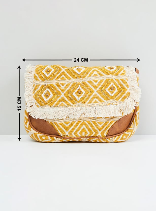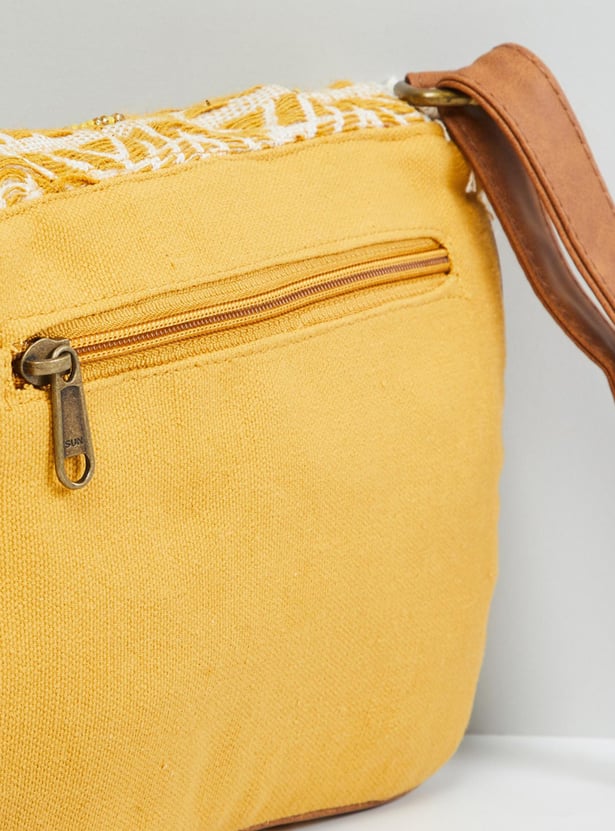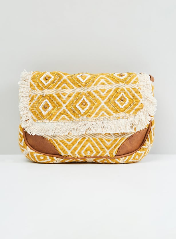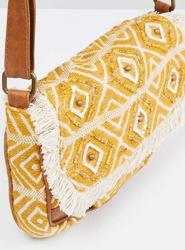 Designed into an ethnic look, this sling bag is complemented with a zip closure and an adjustable flat strap detail. It is an ideal pick to slay your everyday wardrobe while solving your storage woes with its spacious compartments.