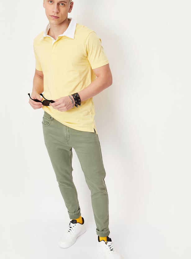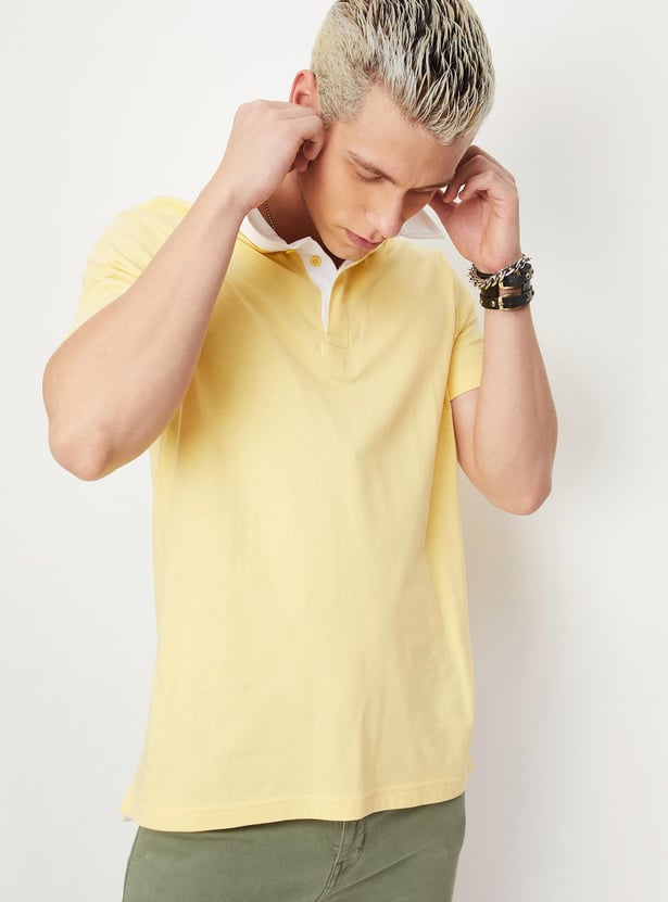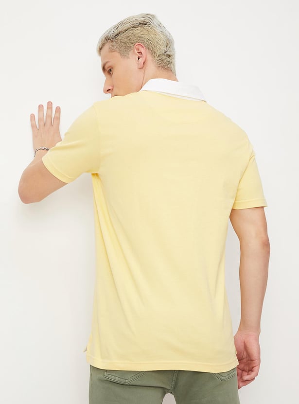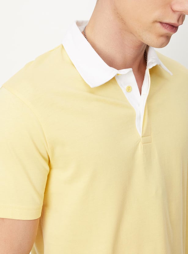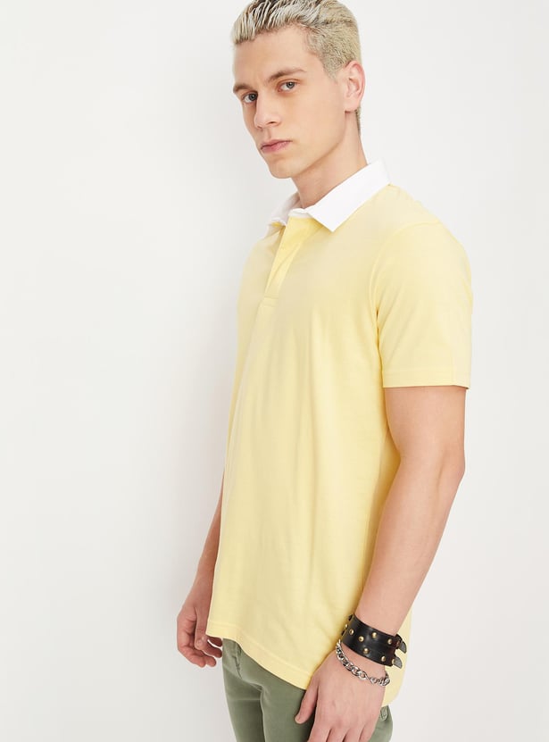 Refresh your casual wardrobe with this T-shirt with a contrast polo collar. It is designed with a solid tone with short sleeves, a slim fit profile, and a step hem. Ace the look by styling this tee with jeans and sneakers.