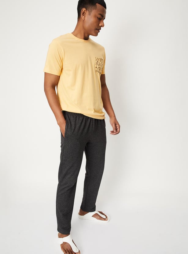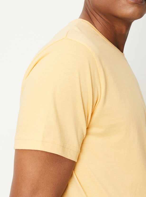 Run errands or relax around your home in this T-shirt rendered in a solid tone. It features a crew neck, short sleeves, and a patch pocket on the chest with abstract prints.