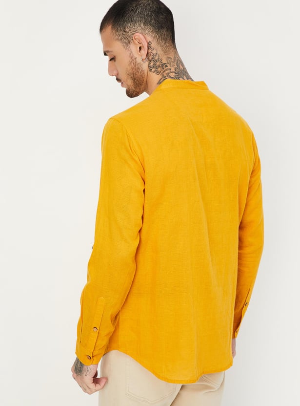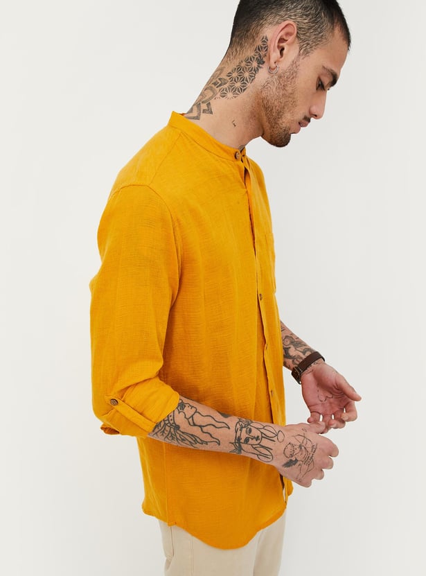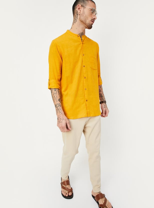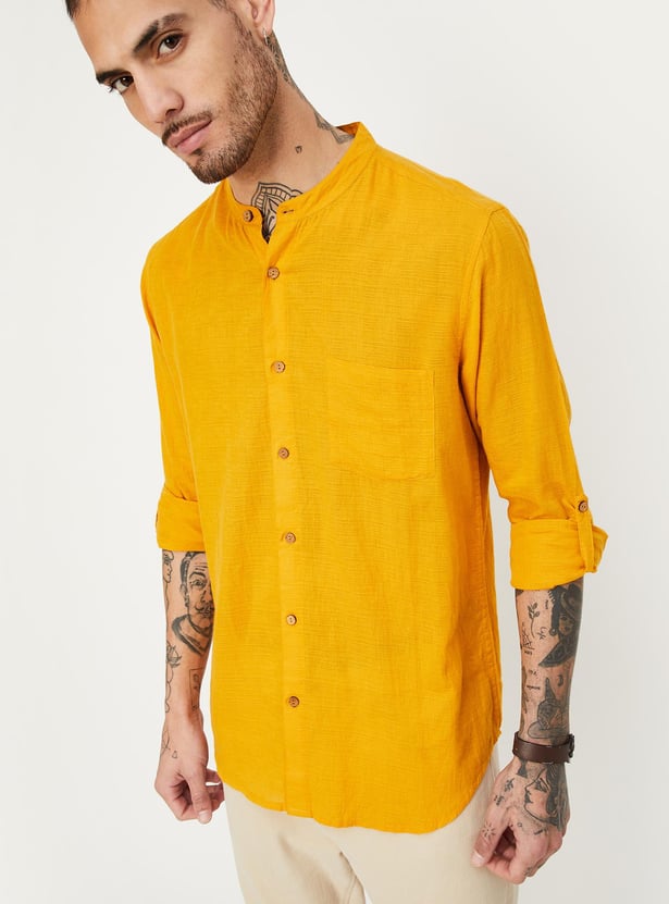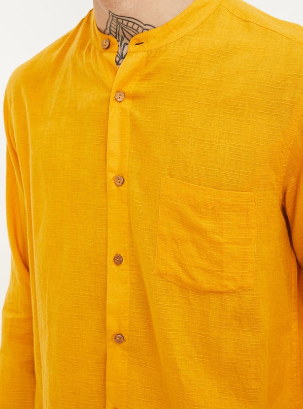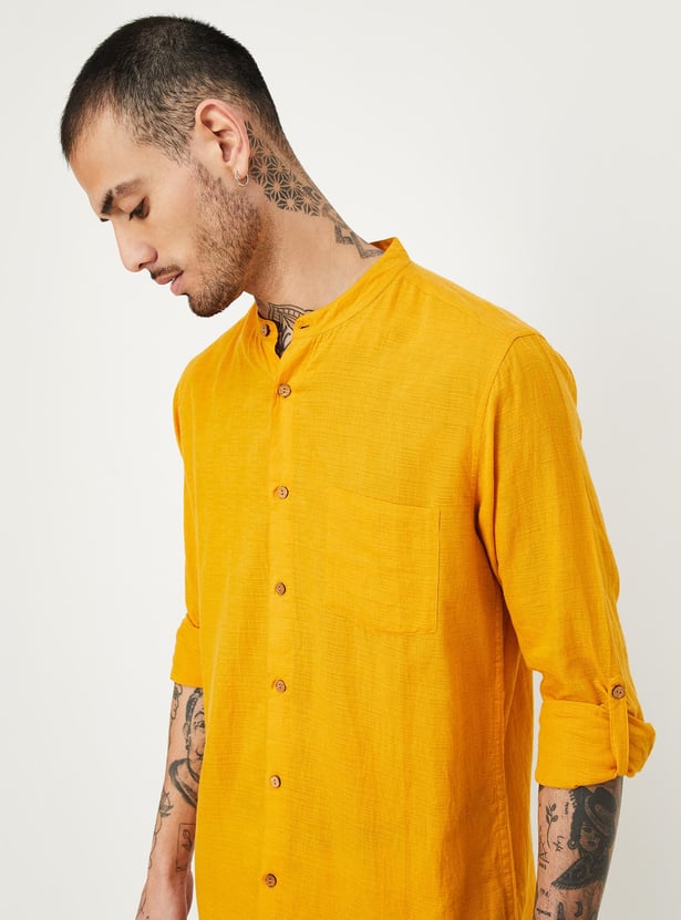 Add a touch of elegance and versatility to your wardrobe with this solid kurta featuring a mandarin collar, full sleeves with buttoned cuffs, a patch pocket, a front button placket, and a curved hemline. The clean lines and monochromatic simplicity make it an ideal canvas for accessorizing or pairing with different bottoms, ensuring a polished and classic look for various occasions.