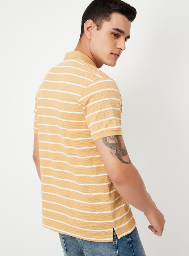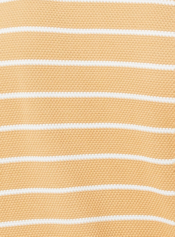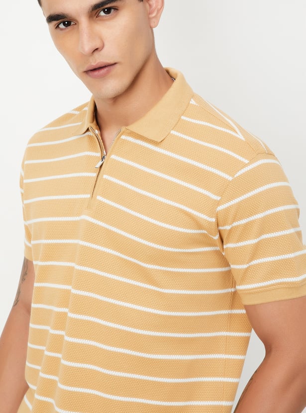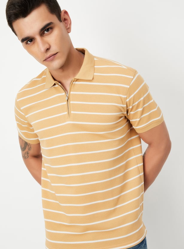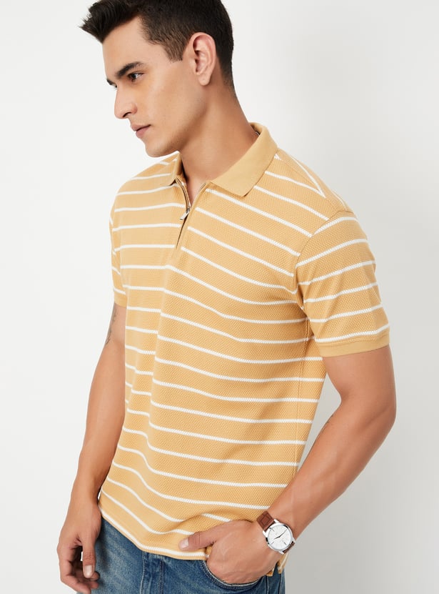 Add a sporty touch to your wardrobe with this striped polo t-shirt. Featuring a classic polo collar, zip closure, and half sleeves, it’s a stylish and comfortable option for casual days or a laid-back outing.