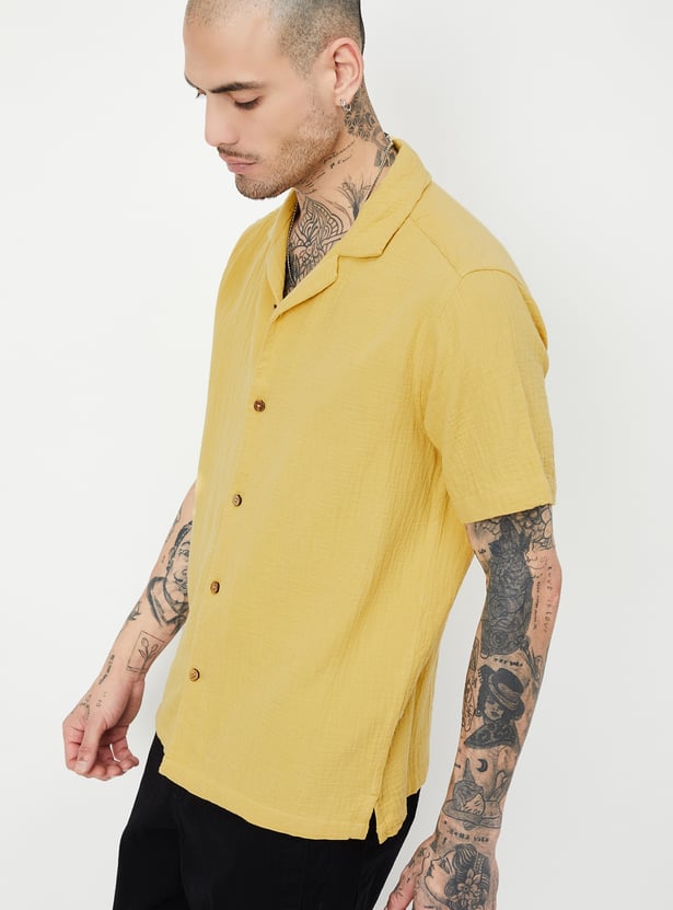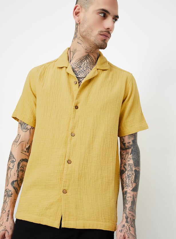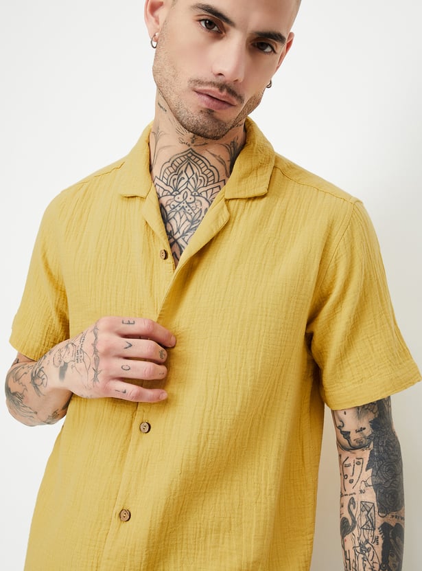This textured slim fit short kurta features a resort-style collar with a button placket and half sleeves, blending traditional charm with a relaxed, modern fit.