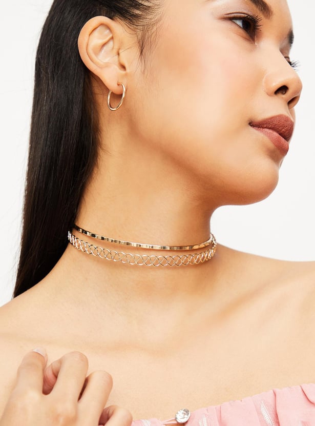 Add an edgy flair to your ensemble with this pair of choker cuffs. It includes a slender necklace and a linked necklace that can be stacked together or donned individually to create unique looks.
