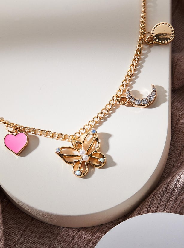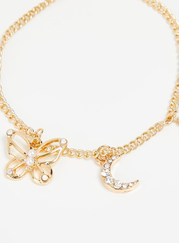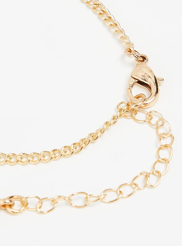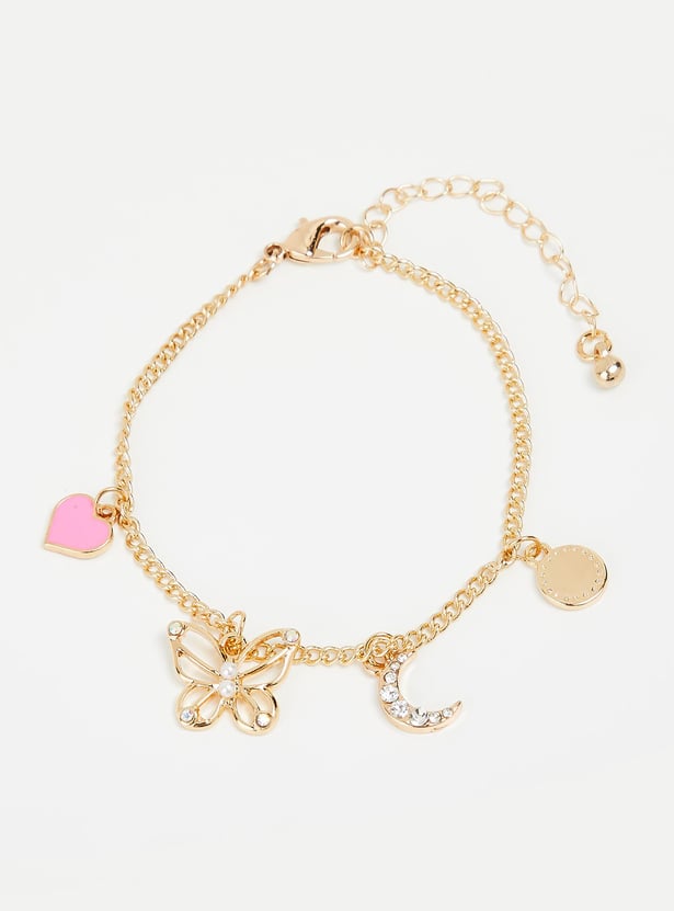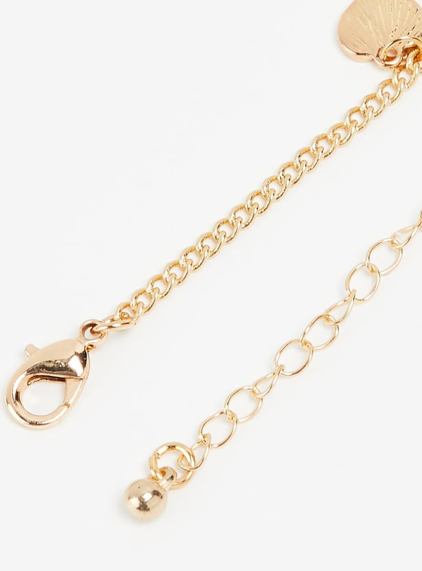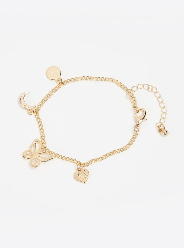 Dainty and elegant, this bracelet is a sure way to elevate your look. It has a chain link design and is peppered with station charms and embellishments to lend an alluring flair. This bracelet is secured with a lobster clasp.