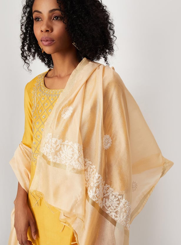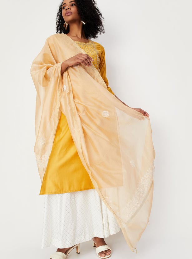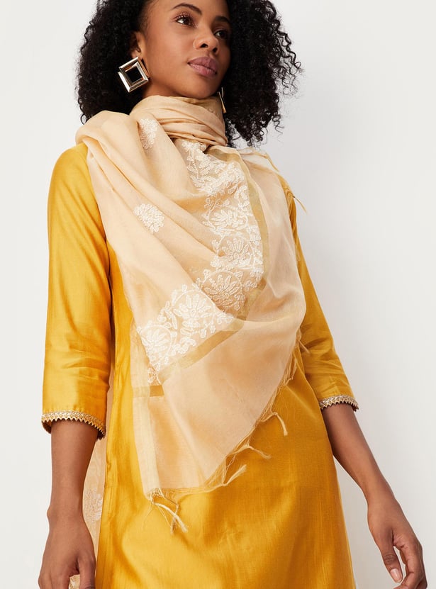 Brighten up any occasion by accessorizing your outfit with this elegant dupatta. It flaunts a chikankari surface and tassel details. It is made from a soft material.