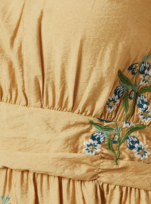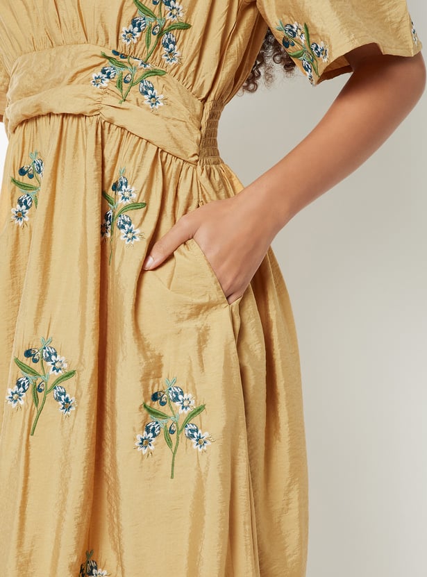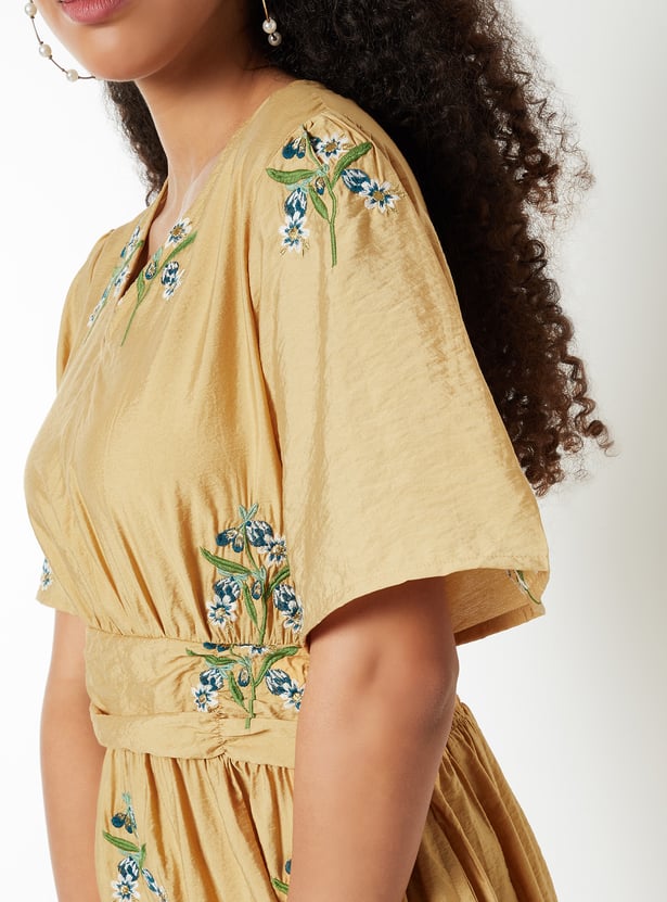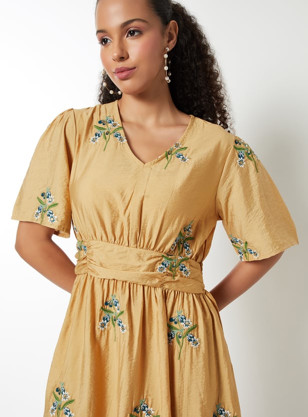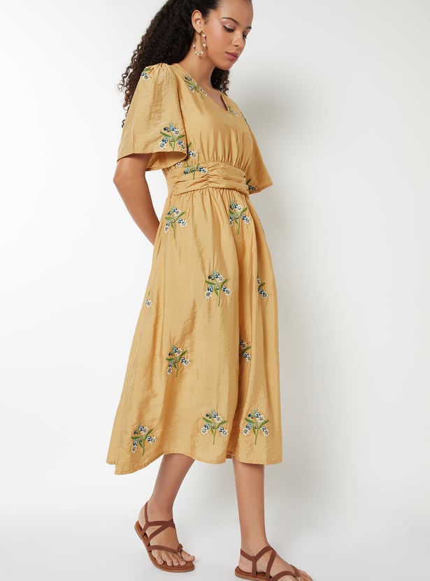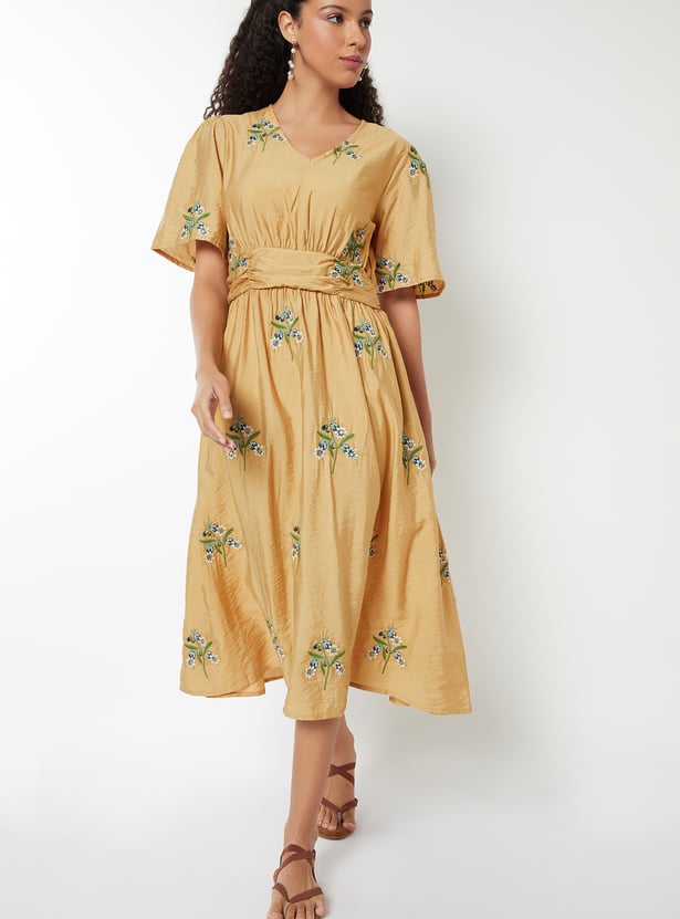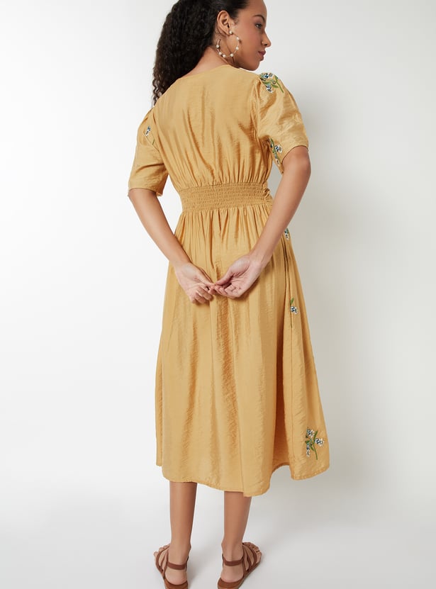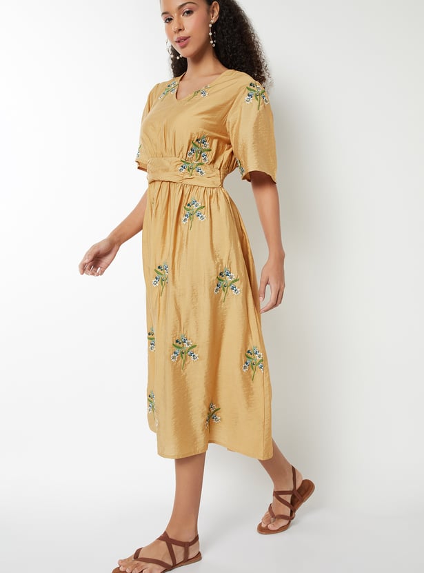 Bring a touch of elegance to your wardrobe with this embroidered A-line dress, featuring a flattering V-neck, half sleeves, and a graceful midi length. Delicate embroidery adds charm and detail, making it perfect for both casual and semi-formal occasions.
