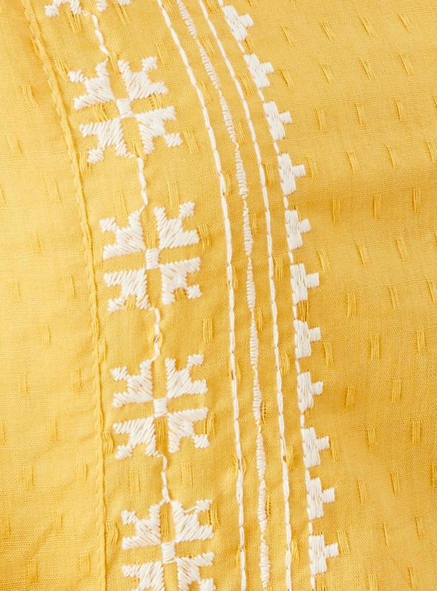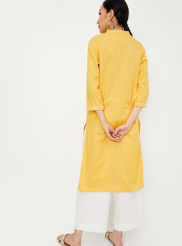 Create an effortless look with this straight kurta. It has three-quarter sleeves, pockets, a band collar with an embroidery design on the front and a button placket. To get an elegant look, wear this kurta with a pair of leggings and sandals.