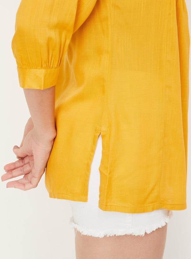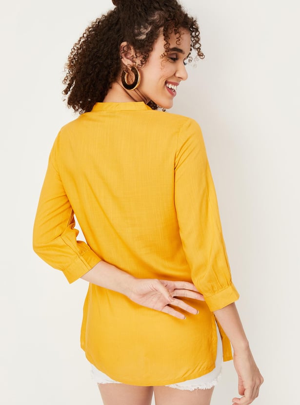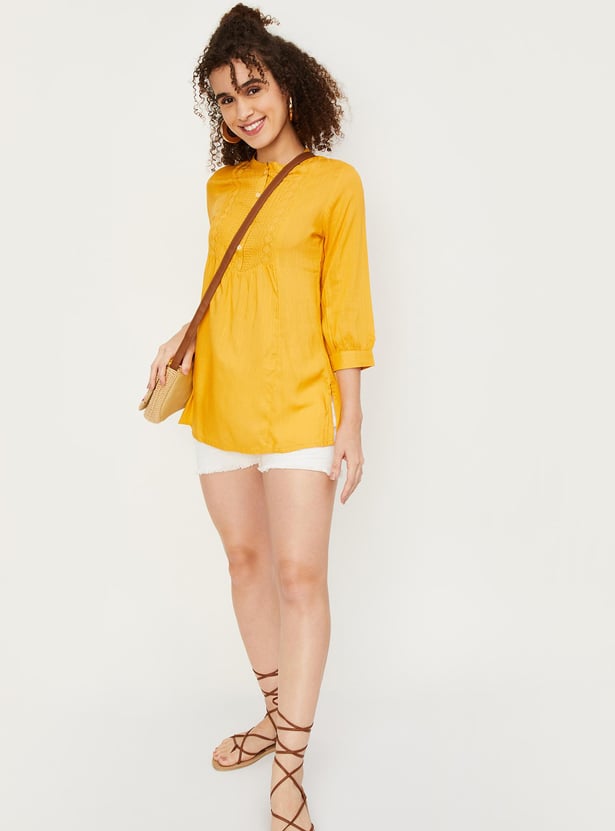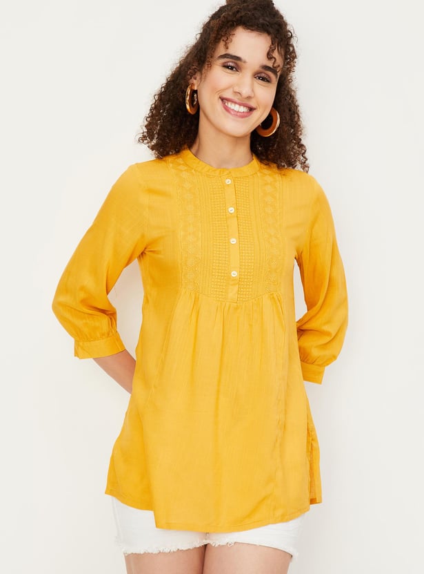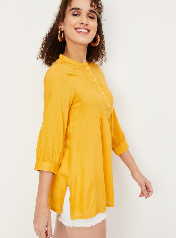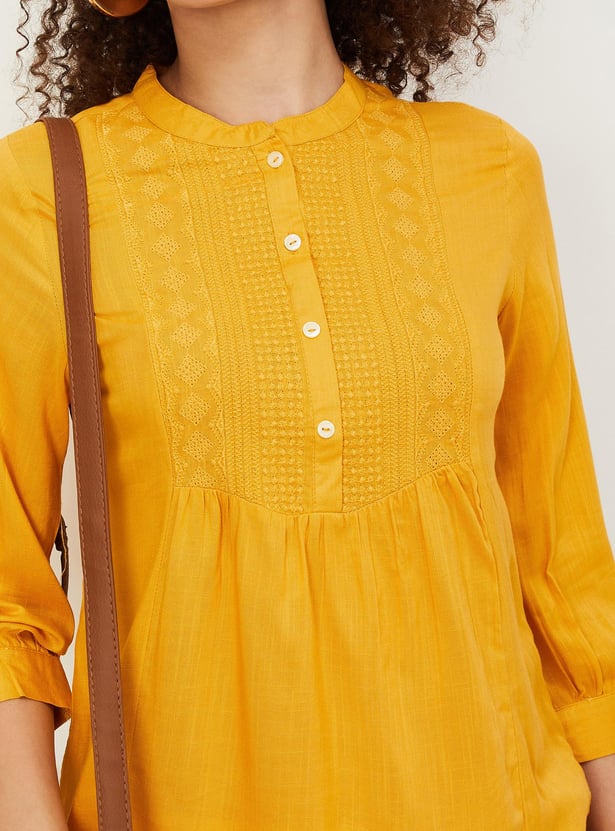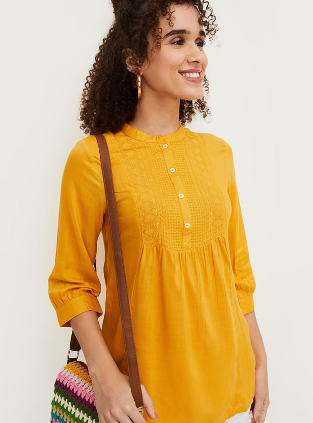 Refresh your casual wardrobe with this short kurti. It features a band collar with a button placket, three-quarter sleeves, an embroidered yoke and a straight hem. Create a fusion look by teaming up this kurti with jeans and flat sandals.