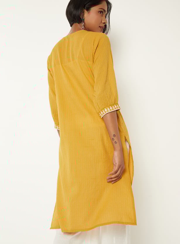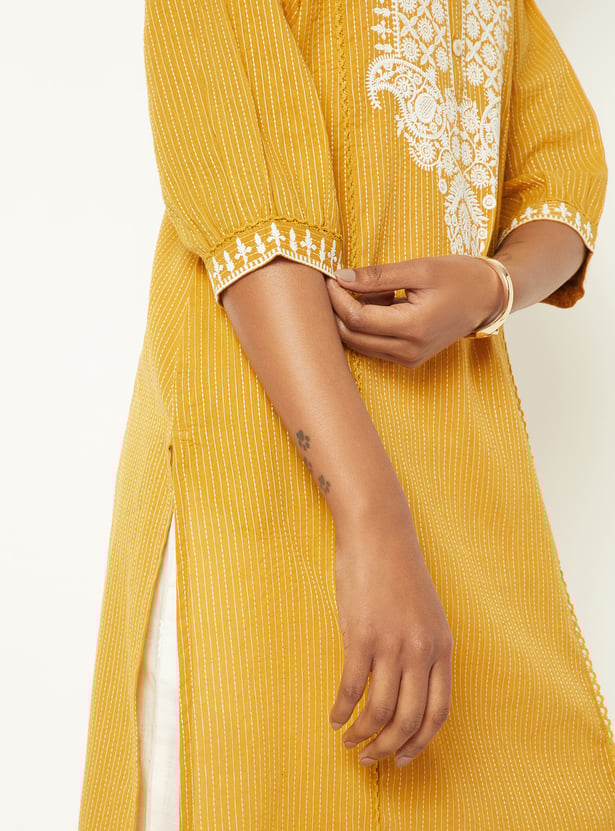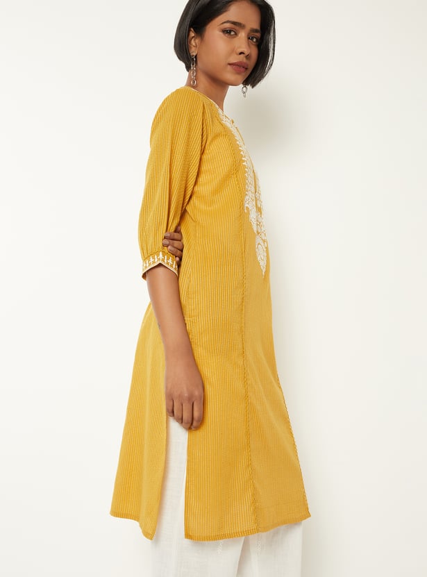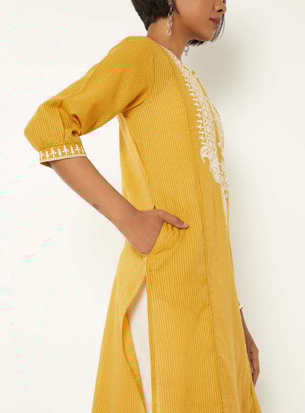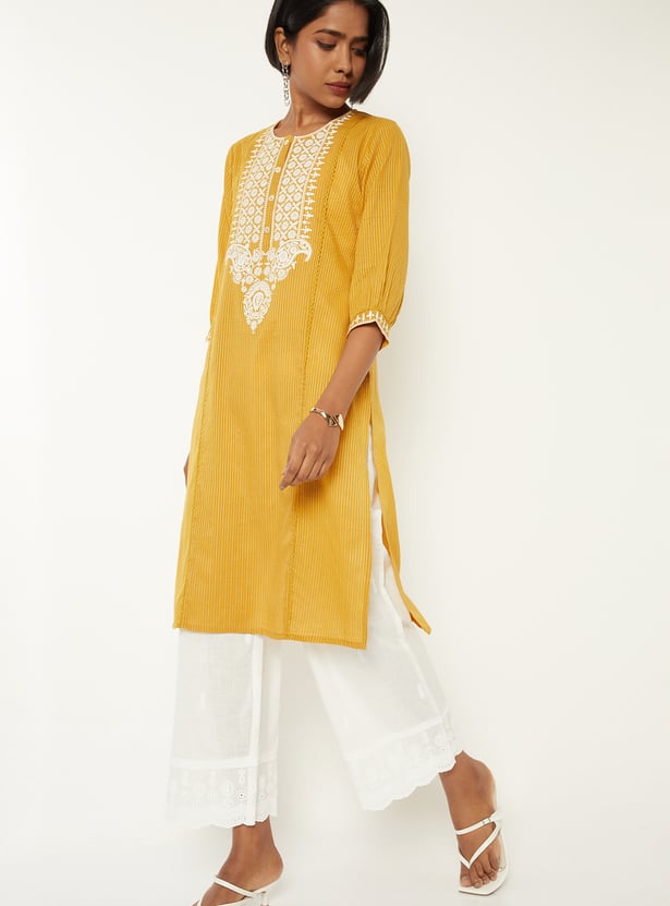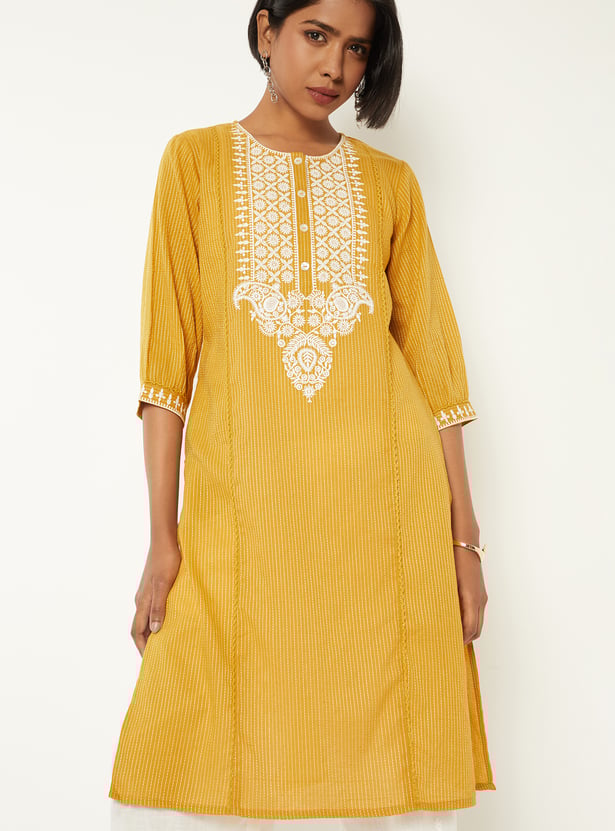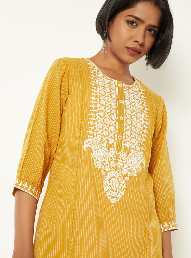 This embroidered straight kurta features a round neckline with a detailed embroidered yoke for a refined finish. Designed with 3/4th sleeves and a functional side pocket, it combines comfort with graceful everyday styling.