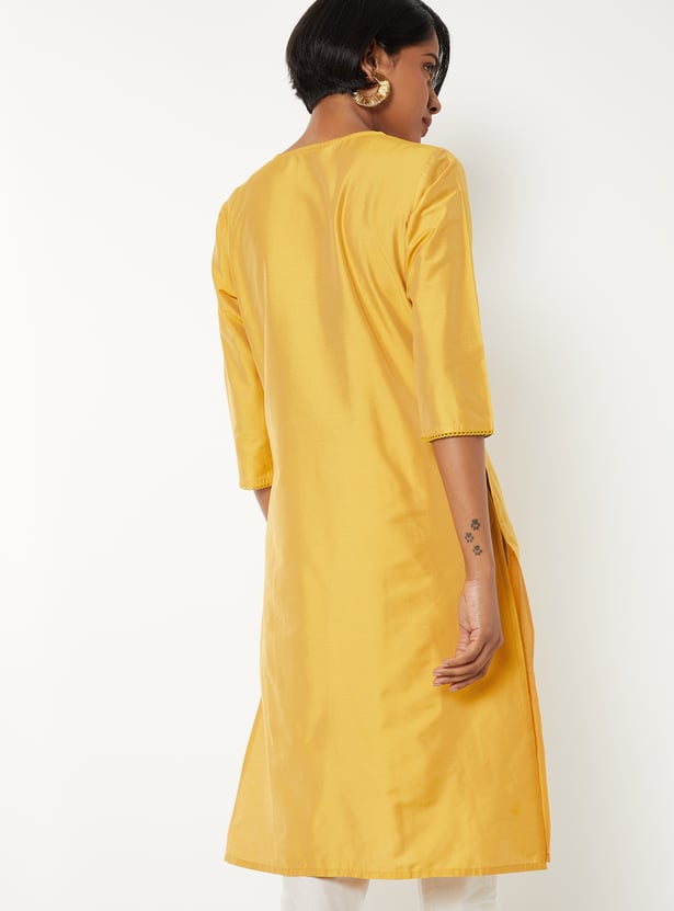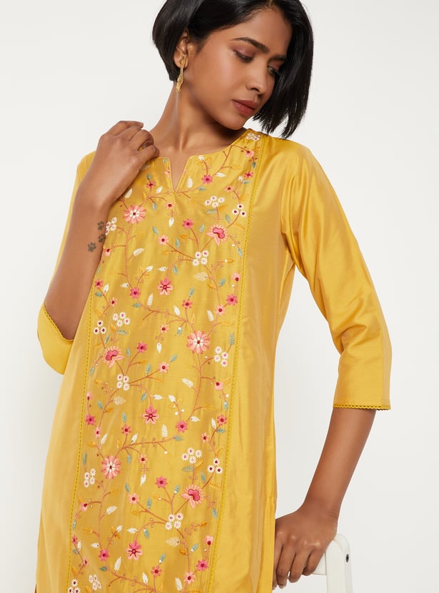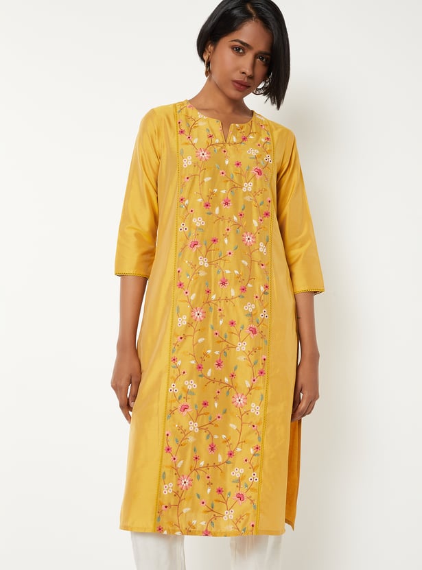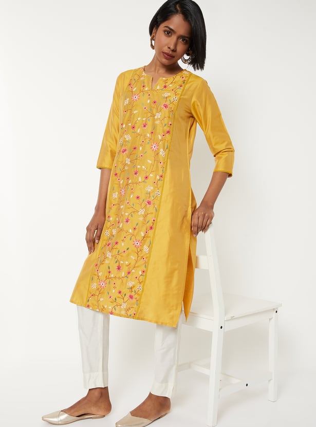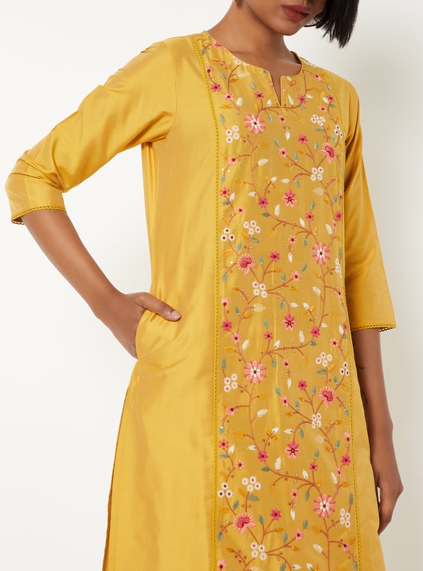 Elegant and versatile, this embroidered straight kurta is designed with a notched neck and 3/4th sleeves. Featuring delicate embroidery, a convenient side pocket, and side slits for ease of movement.