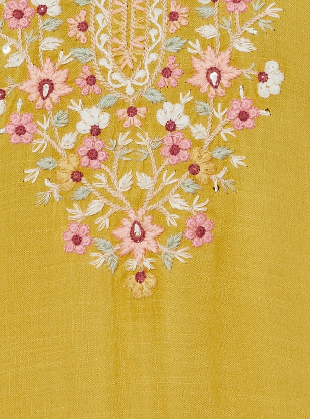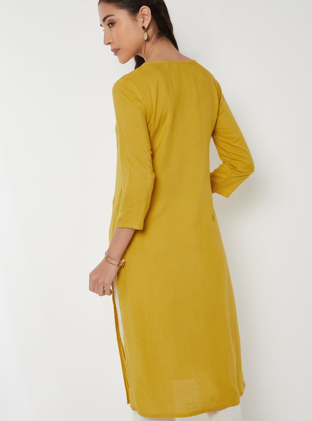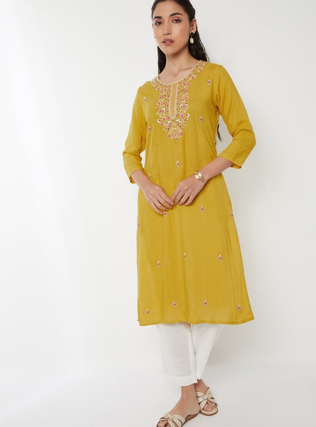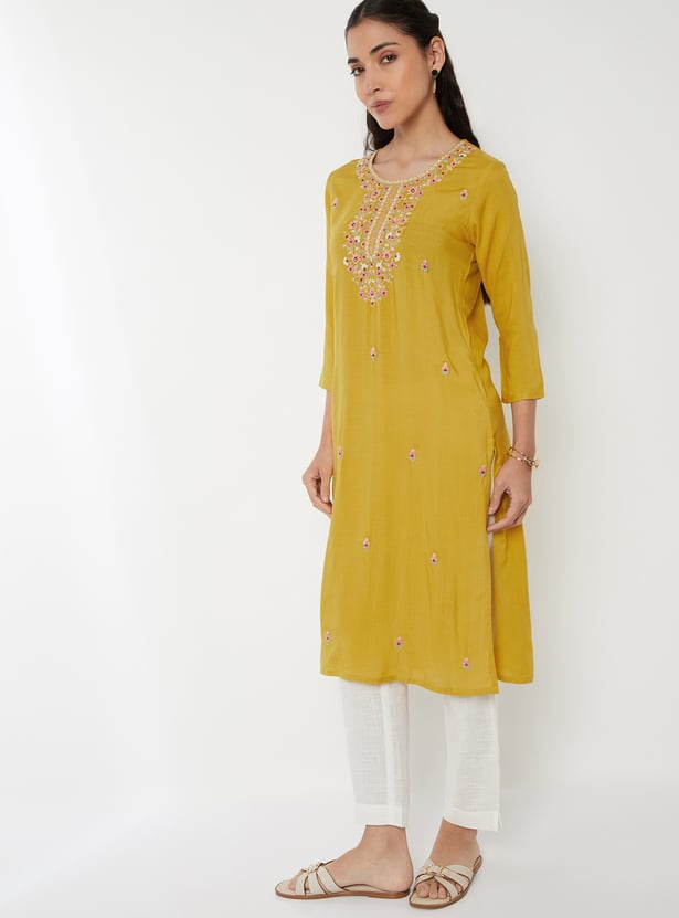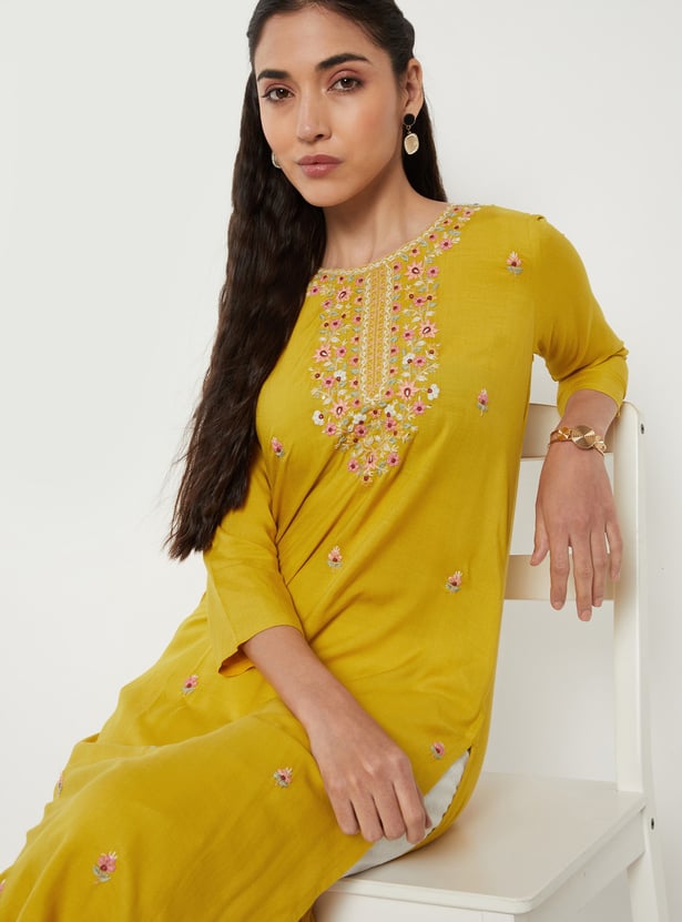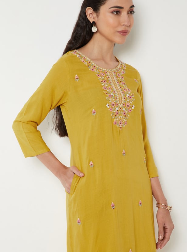 Elegant and versatile, this embroidered straight kurta is designed with a round neck, 3/4th sleeves, side pocket, and side slits for ease and comfort. The embroidery adds a refined detail to the clean silhouette.